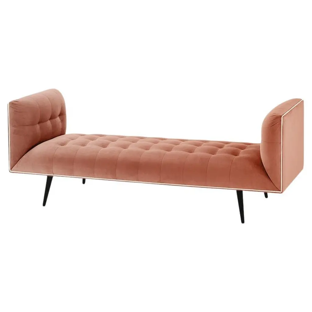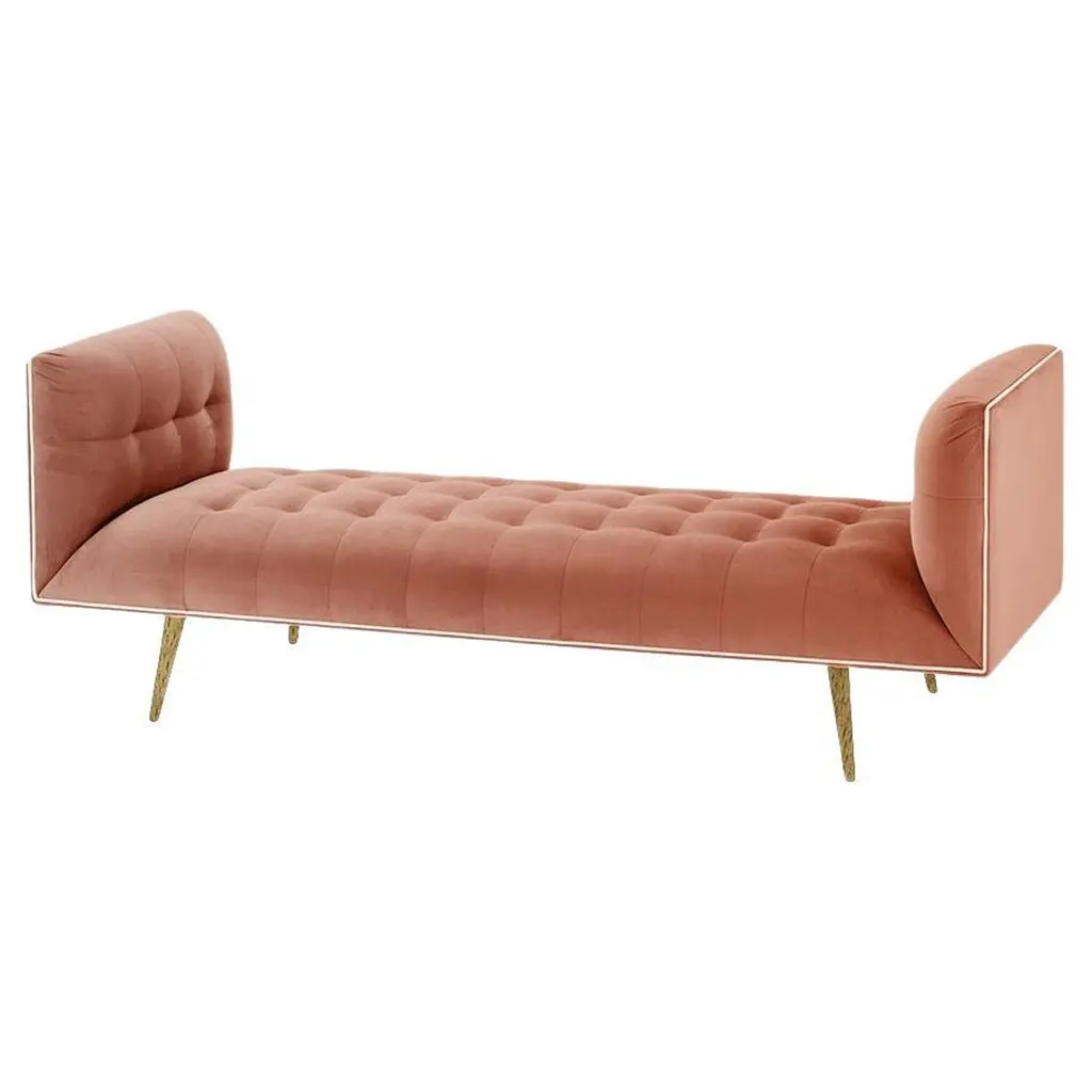 The Dust bench is constructed in solid wood, with an elevated tufted elegant look and a comfortable seating. Handmade with a solid wood base and wood legs. Polished brass metal feet detail is available as an option.The Dust bench is available in a number of different materials, finishes and combinations.Wood finish and upholstery can be fully customizedCOM available: Upholstery 5 yards, piping 0.7 yardsMaterialUpholstery: velvet fabric, Boucle Fabric, COMWood legs: solid wood baseMetal foot detail (on demand)DimensionsAvailable in 2 sizesSmall: 71” W x 28”D x 28” H seat height 16”Large: 79” W x 28”D x 28” H seat height 16”Pictured inParis Mousse, smooth shell pipping, gold lacquered wood feet.