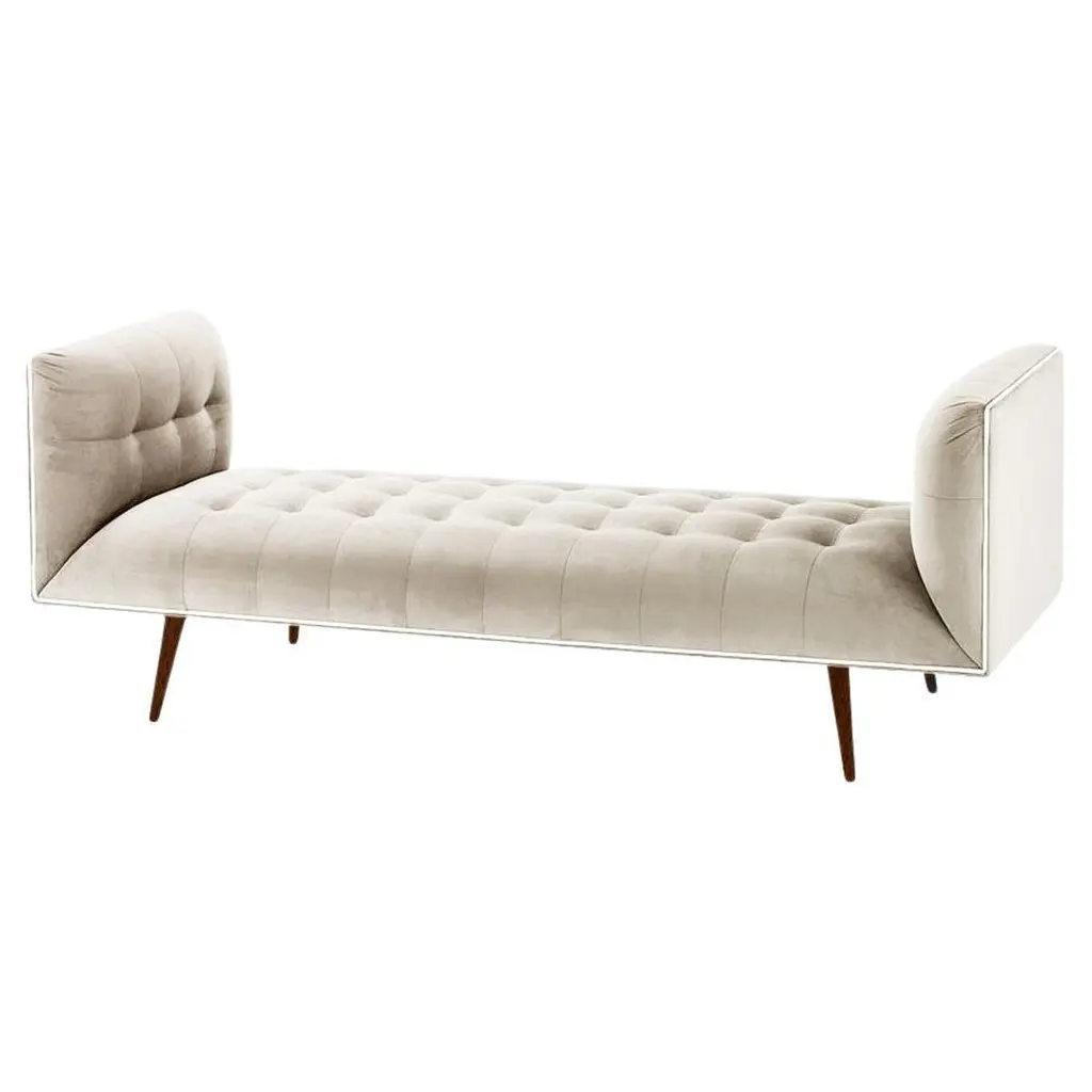 The Dust bench is constructed in solid wood, with an elevated tufted elegant look and a comfortable seating. Handmade with a solid wood base and wood legs. Polished brass metal feet detail is available as an option.The Dust Bench is available in a number of different materials, finishes and combinations.Wood finish and upholstery can be fully customizedCOM Available : Upholstery 5 yards, piping 0.7 yardsMaterialUpholstery : Velvet Fabric, Boucle Fabric, COMWood legs : Solid Wood baseMetal foot detail (on demand)DimensionsAvailable in 2 sizesSmall: 71” W x 28”D x 28” H Seat height 16”Large: 79” W x 28”D x 28” H Seat height 16”Pictured inParis Mousse, Smooth Shell Pipping, Gold Lacquered Wood Feet.