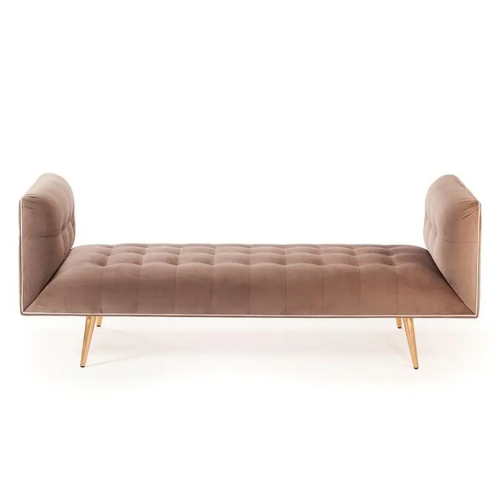 The Dust bench is constructed in solid wood, with an elevated tufted elegant look and a comfortable seating. Handmade with a solid wood base and wood legs. Polished brass metal feet detail is available as an option.The Dust bench is available in a number of different materials, finishes and combinations.Wood finish and upholstery can be fully customizedCOM Available : Upholstery 5 yards, piping 0.7 yardsMaterialUpholstery : Velvet Fabric, Boucle Fabric, COMWood legs : Solid Wood baseMetal foot detail (on demand)DimensionsAvailable in 2 sizesSmall: 71” W x 28”D x 28” H Seat height 16”Large: 79” W x 28”D x 28” H Seat height 16”Pictured inParis mousse, smooth shell pipping, gold lacquered wood feet.