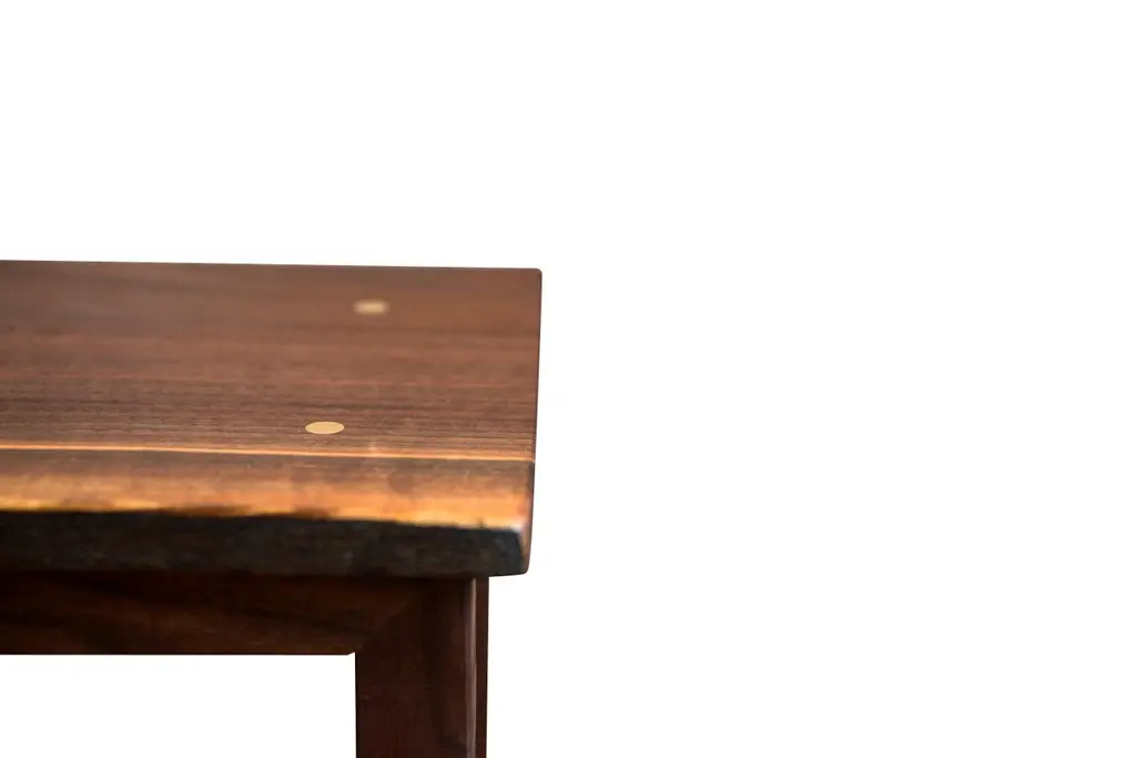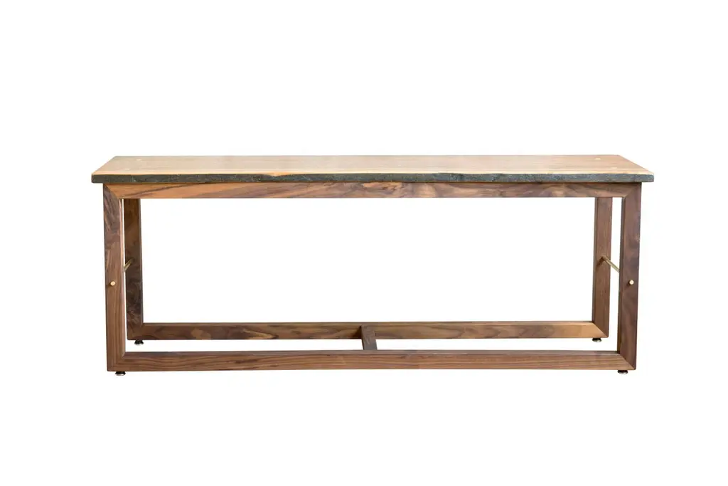 Solid wood construction hand crafted bench. This bench is shown in walnut with brass detailing.Measures: 12" W x 48" L x 18" HHand made in Los Angeles, California.