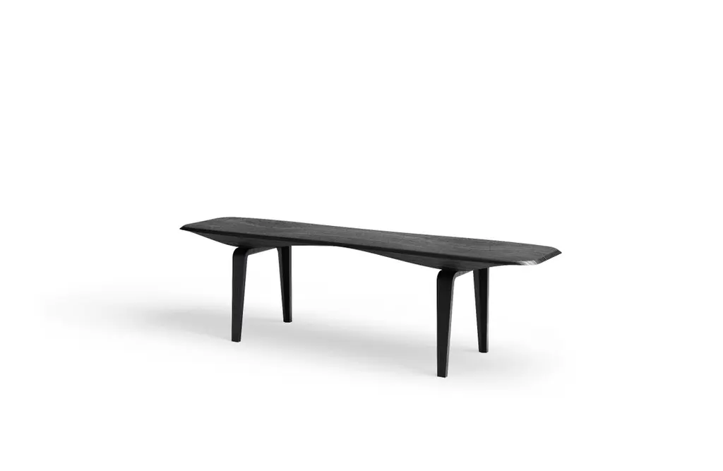 Named a 2018 Best of Year Awards Honoree by Interior Design Magazine. KG bench merges mannerism with engineering. Carved out of thick slabs of Sessile Oak the sinuous arched profile of this bench goes from mysteriously thin to substantial, in a continuous swoop. The KG bench in the new ebonized wood all-black version has a beautiful grain which emphasizes the unique geometry of the piece. The Sessile-Oak has undergone an ebonizing process to create a gorgeous all-black matte finish.Designed in Brooklyn by Italian-born architect Ale Preda for Miduny, this artisanal product is made in Italy by master craftsmen. The thick wood slab is carved for several hours on a 5-axis CNC machine, hand sanded, stained and finished with a slightly reflective gloss. The legs follow a similar workflow. The overall process takes no less than 25 steps. Each bench features a hand-stamped unique serial number on the underside and comes with a signed certificate of authenticity.As all our products, the KG bench is designed to ship flat inside a custom built box and minimal assembly is required. This allows shipping to be more efficient and sustainable. Each of the two legs fits into a carved slot and is attached with two countersunk bolts.
