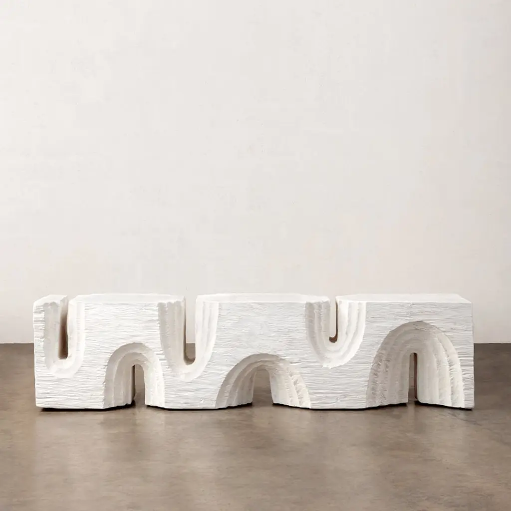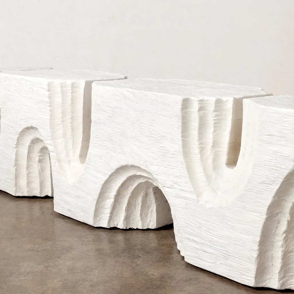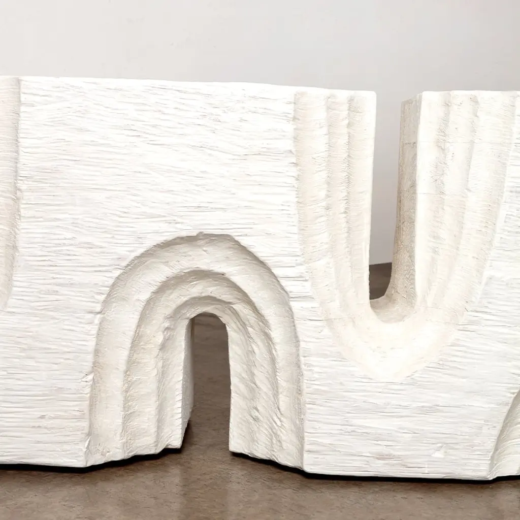 The Echo Bench by Kelly Wearstler is a sculptural statement piece that blurs the line between functional furniture and modern art. Hand-carved from solid reclaimed Douglas Fir, its monolithic form features undulating arches and a heavily textured surface, embodying the essence of modern organic design. Crafted by local artisans in Los Angeles, each bench showcases the natural beauty of the wood, with exposed end grain and a tactile finish. Available in three distinct finishes—Natural, White Gesso, and Ebonized—and two sizes (50" and 72"), the Echo Bench offers versatility for various interior settings. Whether placed in an entryway, living room, or at the foot of a bed, the Echo Bench serves as a functional seating solution and a captivating focal point.
