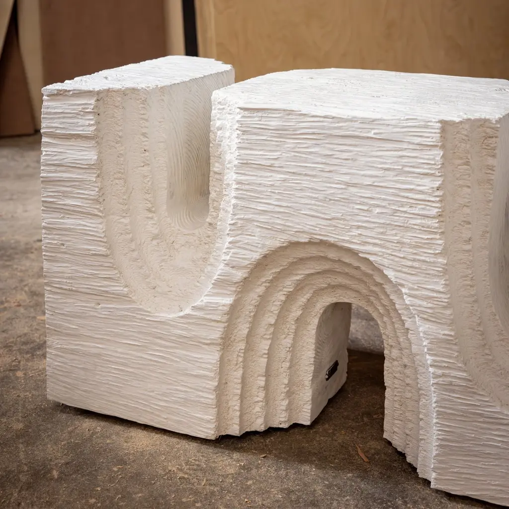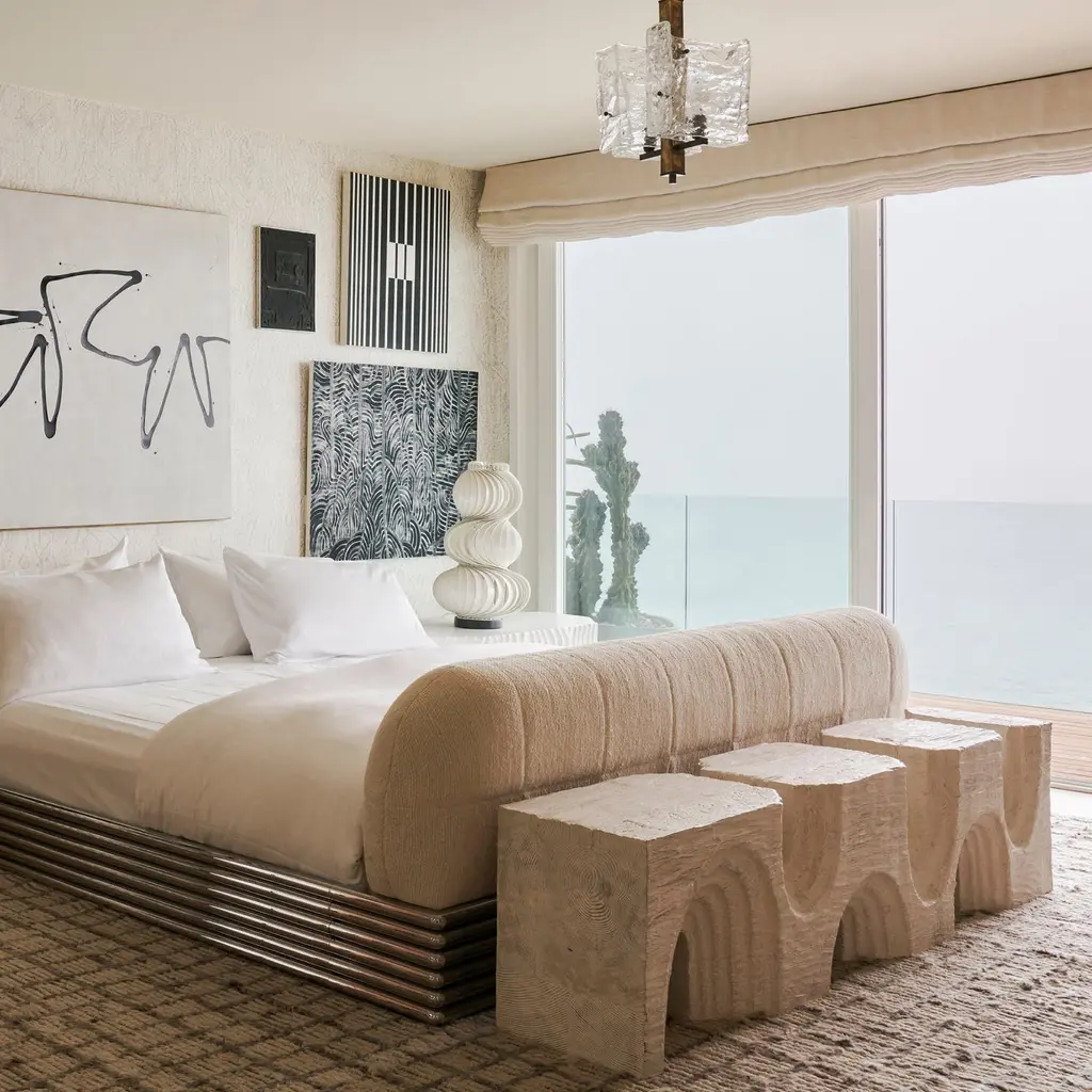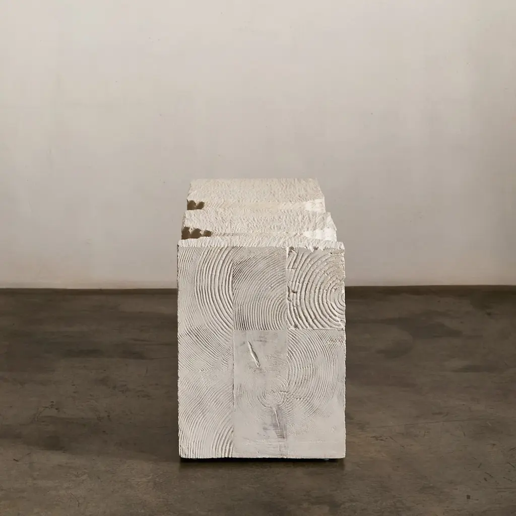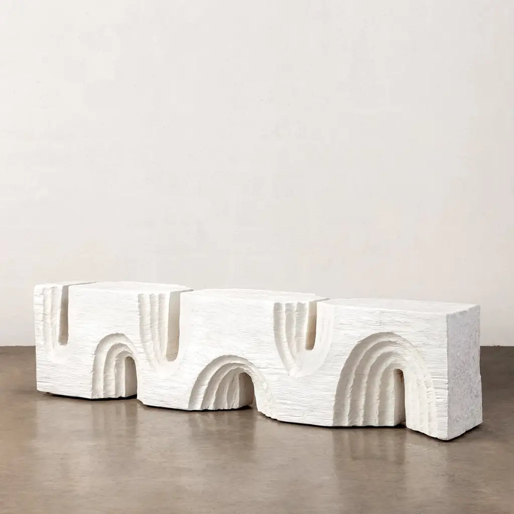 The Echo Bench by Kelly Wearstler is a sculptural statement piece that blurs the line between functional furniture and modern art. Hand-carved from solid reclaimed Douglas Fir, its monolithic form features undulating arches and a heavily textured surface, embodying the essence of modern organic design. Crafted by local artisans in Los Angeles, each bench showcases the natural beauty of the wood, with exposed end grain and a tactile finish. Available in three distinct finishes—Natural, White Gesso, and Ebonized—and two sizes (50" and 72"), the Echo Bench offers versatility for various interior settings. Whether placed in an entryway, living room, or at the foot of a bed, the Echo Bench serves as a functional seating solution and a captivating focal point.