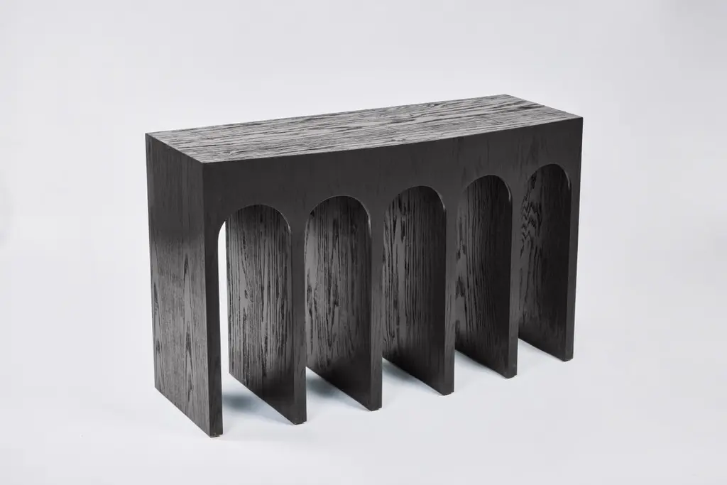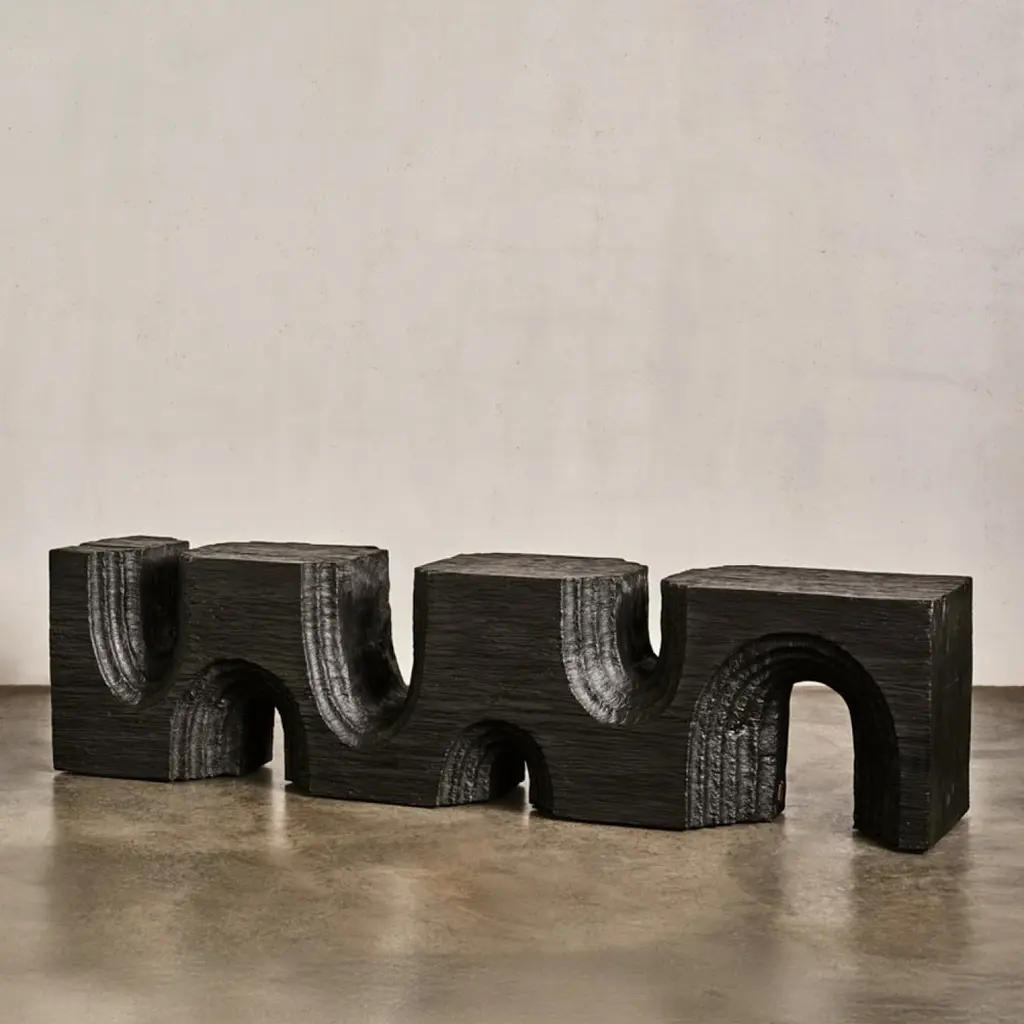 The Echo Bench by Kelly Wearstler is a sculptural statement piece that blurs the line between functional furniture and modern art. Hand-carved from solid reclaimed Douglas Fir, its monolithic form features undulating arches and a heavily textured surface, embodying the essence of modern organic design. Crafted by local artisans in Los Angeles, each bench showcases the natural beauty of the wood, with exposed end grain and a tactile finish. Available in three distinct finishes—Natural, White Gesso, and Ebonized—and two sizes (50" and 72"), the Echo Bench offers versatility for various interior settings. Whether placed in an entryway, living room, or at the foot of a bed, the Echo Bench serves as a functional seating solution and a captivating focal point.