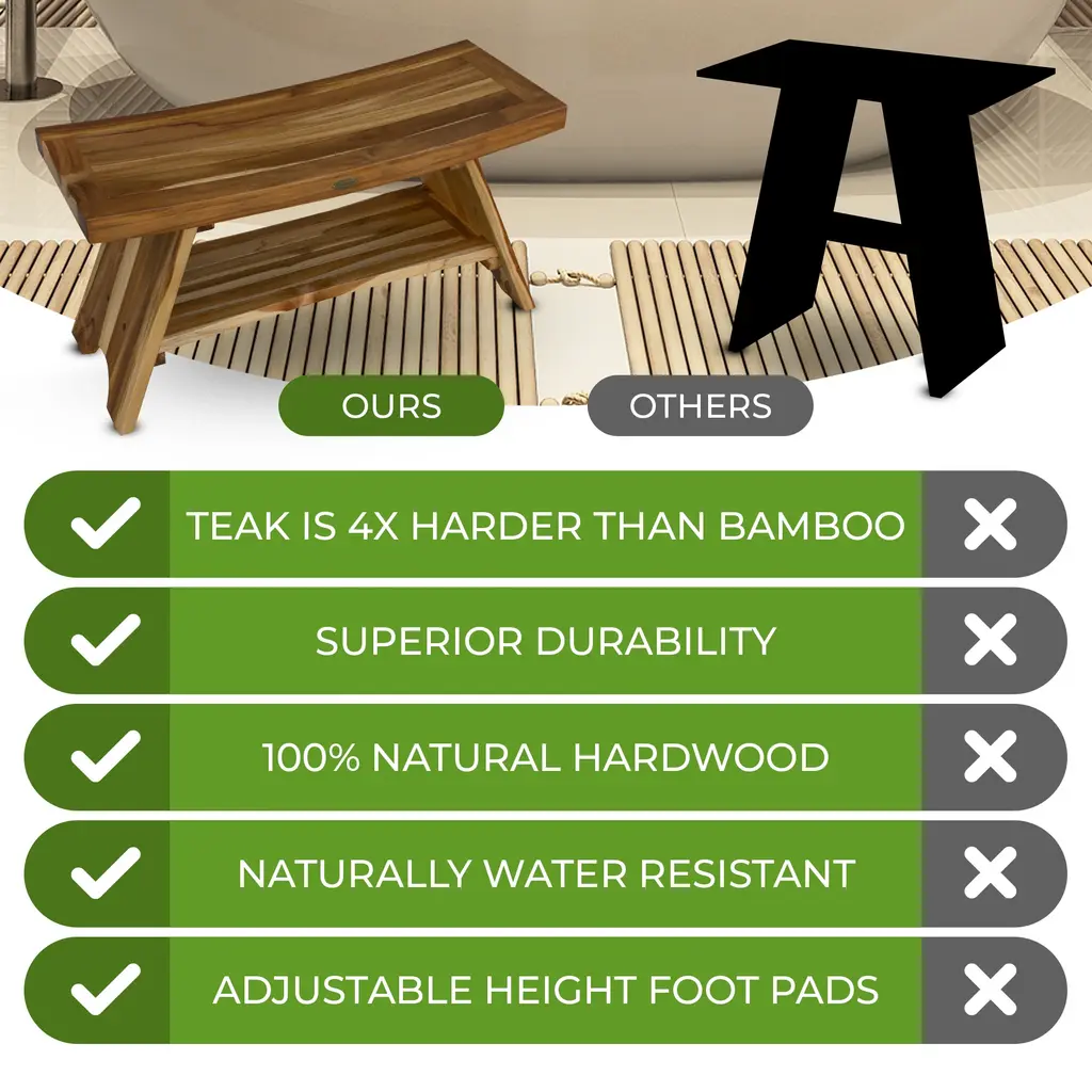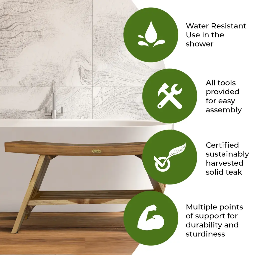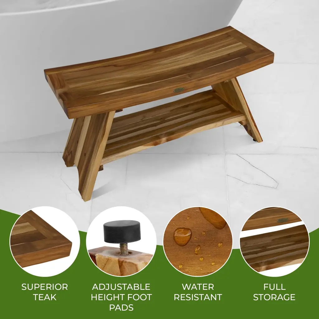 Elevate your bathroom with the Serenity teak bench, a beautifully crafted piece that combines luxury and functionality. Designed to enhance your shower experience, this bench is made from 100% Indonesian plantation-grown teak wood, known for its high oil content and exceptional durability. Its dimensions—36 inches in length, 14 inches in depth, and 18 inches in height—provide generous seating space, making it the perfect teak shower chair for inside your shower. Created by a woman-owned company, this bench features height-adjustable rubber feet, ensuring it stays stable on any surface. The built-in shelf adds a touch of convenience, offering easy access to your shower essentials. Whether you need a spacious teak shower bench or a versatile stool, this piece brings both style and reliability to your bathroom. With the natural water-resistant properties of teak, it's ideal for humid environments, ensuring long-lasting beauty and function. Designed for those who desire a spa-like experience at home, our teak shower benches support up to 250 lbs., merging robust construction with elegant aesthetics. Whether you're seeking a practical seating solution or a sophisticated addition to your bathroom decor, this modern shower bench delivers in every aspect. Experience the blend of form and function with our teak shower chairs, crafted for those who appreciate enduring quality and style. Features:Luxury Spa ExperienceBring the Spa Home: Transform your bathroom into a serene retreat with our Serenity wooden shower chair. Crafted from 100% Indonesian teak wood, this water-resistant bench adds a luxurious, spa-like ambiance to your daily routine. Sturdy & Stylish Teak Wood DesignStrength Meets Elegance: Built from dense, sustainably sourced teak wood, this durable shower stool supports up to 250 lbs. Its natural finish enhances any bathroom decor, making it an elegant and functional addition to your shower space. Customizable Comfort with Adjustable FeetStable on Any Surface: This teak shower bench features height-adjustable rubber feet, allowing it to maintain stability on uneven floors. It's designed to adapt to your needs, providing secure and comfortable seating inside your shower. Effortless OrganizationConvenient Storage: The built-in shelf on this teak bathroom bench keeps your shower essentials within easy reach. Its thoughtful design promotes an organized and clutter-free space, enhancing your shower experience. Eco-Friendly ExcellenceSustainable Style: Proudly designed by a woman-owned company, this teak wood shower bench is made from sustainably sourced plantation-grown teak. It's a stylish, eco-friendly, and long-lasting addition to any bathroom. DimensionsPerfectly Sized: Measuring 36 inches in length, 14 inches in depth, and 18 inches in height, this bench is sized to fit comfortably in most shower spaces. Weight LimitReliable Support: This bench is tested to hold up to 250 pounds, ensuring dependable support for all users. Assembly RequiredEasy to Assemble: Includes full instructions, tools, and hardware for quick and simple assembly, so you can enjoy your new teak shower bench in no time.