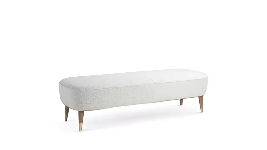 Upholstered in Orsetto fabric, col. 01/1(33% viscose, 29% acrylic, 15% wool, 8% cotton, 7% polyester, 6% linen, 1% elastane) with padded back in bi-density foam 23-25 and cotton batting. Side and base in foam 23kg and cotton batting. Structure in medium (MDF), birch veneer and Hardboard. Base in stained beech with leg bases in brass. Manufactured in Europe