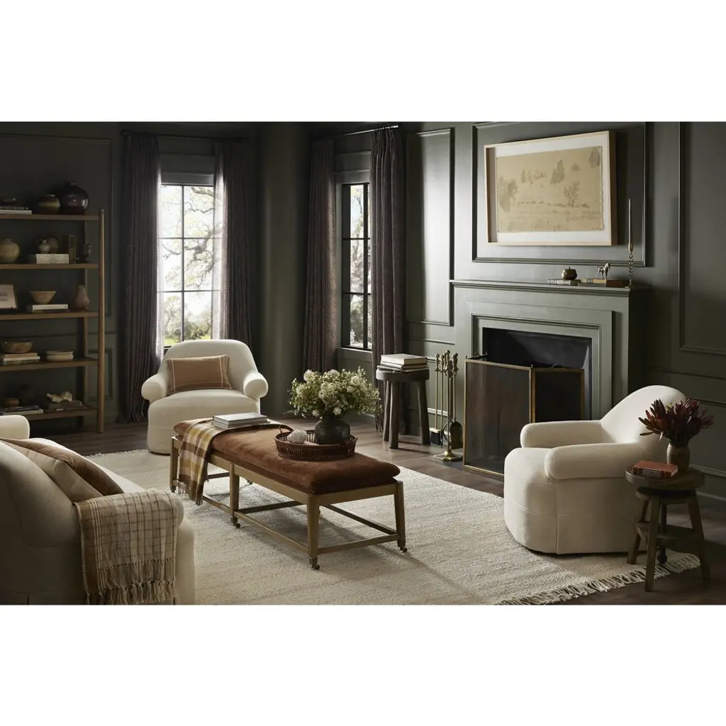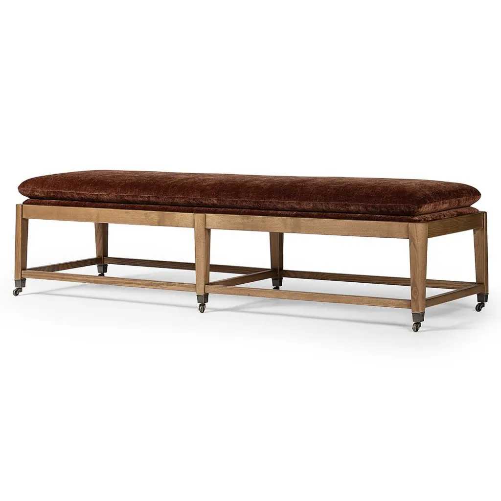 A design collaboration by Amber Lewis and Four Hands. For an updated take on an antique-inspired look, a six-leg accent bench features soft, semi-attached cushion seating in a chenille-like velvet, for comfort with track-resistant livability. A toasted ash base includes metal casters finished in an aged brass.