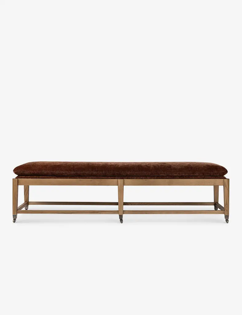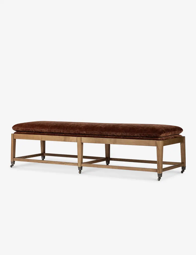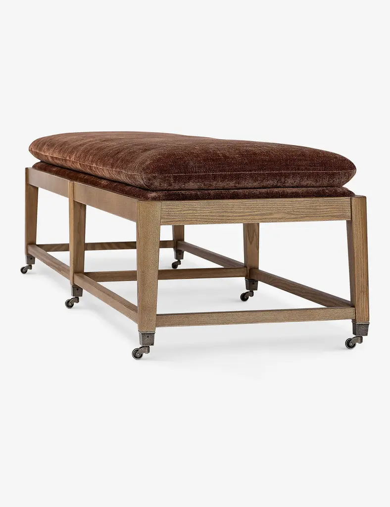 Four Hands brings their exceptional craftsmanship to a timeless collection rooted in Amber Lewis' perennial California style. The Eleanor bench showcases antique styling with a toasted ash base on six legs with brass-finished casters. The semi-attached cushion is upholstered in velvet to complete the look with an elegant touch.
