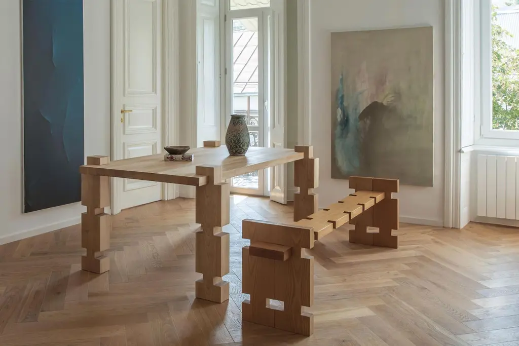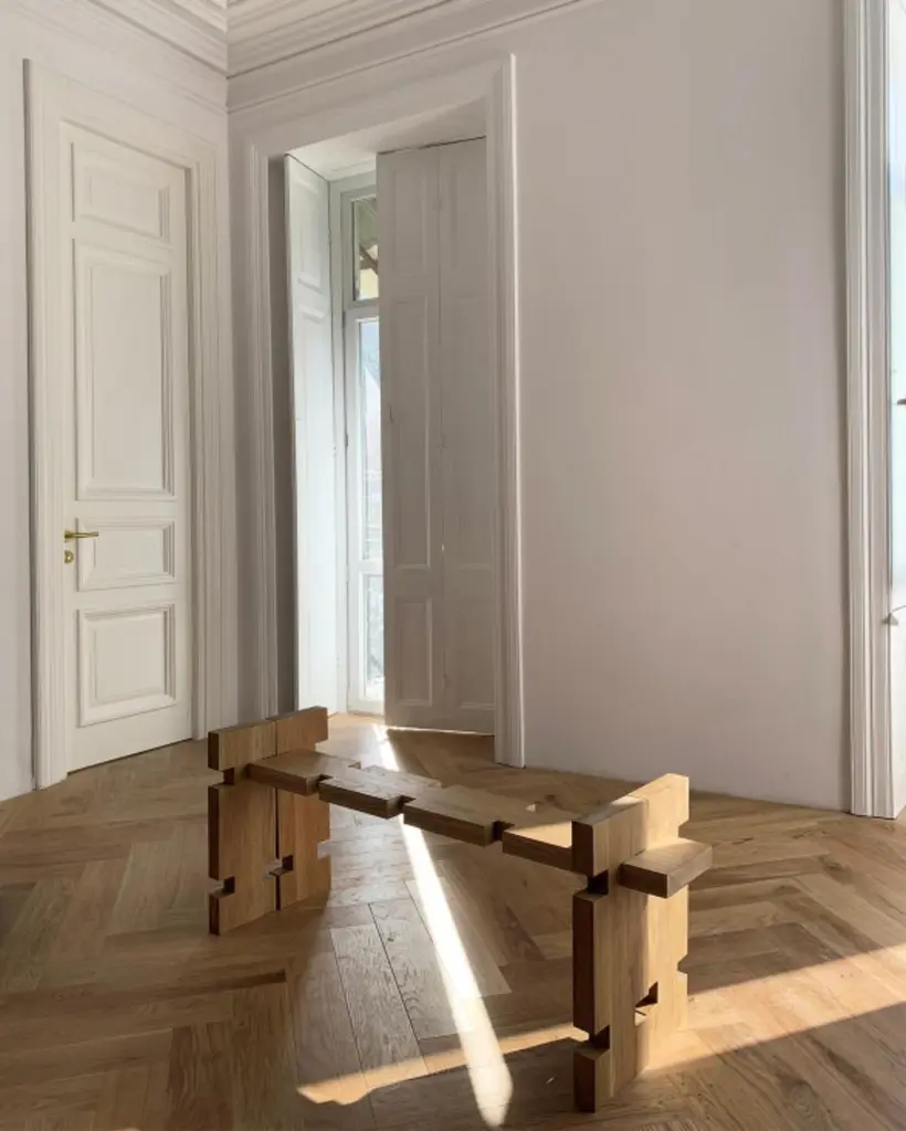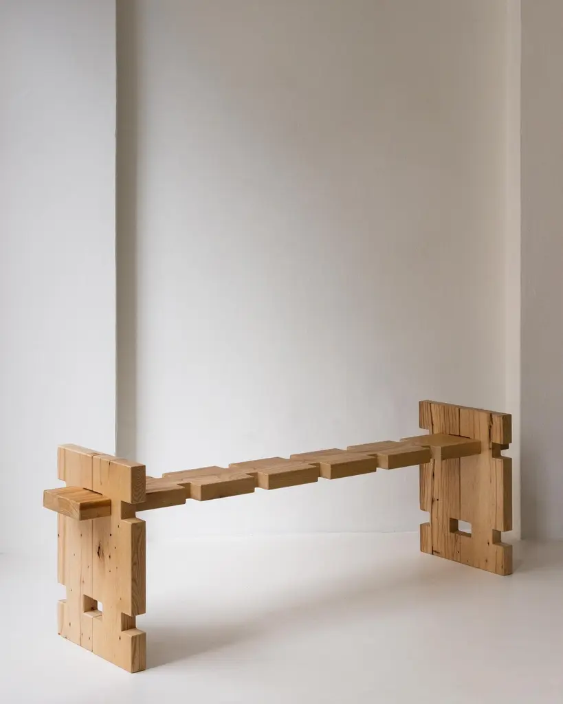 Element 2 Seater Bench by Idaaf ArchitectsDimensions: W 125 x D 40 x H 55 cmMaterials: Century Old OakMade of solid Maple wood, this 3-seater bench ‘Museum’ is one of the pieces of the ‘Element’ collection influenced by the Georgian Oda house and the architect Giorgi Chakhava’s 'Construction Element'.The stool consists of five independent parts inserted into each other. Assembling/disassembling is easy and requires no fasteners. The bench is 2 or 3-seater and is designed so that the legs can be used as barriers between the seats if necessary.‘Element’ Bulk Stool is made using forest trees that have been felled as the result of natural causes or from one hundred years old oak wood beams which once supported a family house. It now continues to work in a different form as an interior sculpture. ‘Element’ It is the specific shape and its modified dimensions that creates the variations of furniture. Due to the changing structures and variety of materials, the ‘element’ is constantly updated and offers the possibility of functional freedom. It is easy to assemble/disassemble and does not require brackets.The ‘Element’ collection was influenced by Georgian traditional Oda houses and the 'Construction Element' created by Giorgi Chakhava (1923-2007), an iconic Georgian architect. While working on her book, "Soviet Bus Stops in Georgia" published in 2017, Nana drew attention to Chakhava’s concrete element invention where he used a simple jigsaw like form to assemble various structures. The Element Collection uses the same basic shape to create different pieces of furniture. It’s changing structures and a variety of materials to provide flexible and functional freedom. It is easy to assemble or disassemble and does not require brackets or fixtures. Created and handcrafted in Tbilisi using domestic materials, the collection combines traditional craftsmanship with the contemporary language of sinuous form which makes them appear sculptural. Each piece results from a well-thought through idea and a delicate construction process. These unique pieces are identifiable by their pronounced patterns and imperfections that together give furniture a warm, lustrous quality. Some of the exhibited wooden pieces are made from the supporting beams of a Georgian Oda House. The collection includes chairs, tables, benches, stools, shelves, consoles and many more. Depending on the material, the items can be used both indoors and outdoors.Idaaf Architects was established in Tbilisi in 2016 and is led by the architect Nana Zaalishvili. Studio works on multidisciplinary principles combining Architecture, Interior Design and Furniture, as well as Research and Material Studies.Each project is the results from the deep cultural, geographical and site research with the aim of creating timeless yet modern architecture and design in Georgia and abroad.
