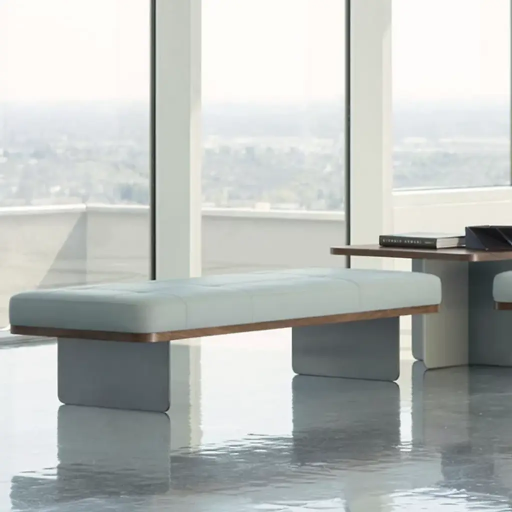 The Elevation Fin Base Bench from Bernhardt Design features quilted upholstery that rests upon metal supports. This modular system integrates wood, metal, and upholstery through geometric shapes and subtly curved profiles. Terry Crews achieves balance between sculptural appeal and functional seating through the bench's clean lines and material contrasts. The fin-leg base creates an asymmetrical foundation that supports the platform and cushioning above. This approach results in furniture that serves both individual seating needs and larger spatial configurations within contemporary environments.
