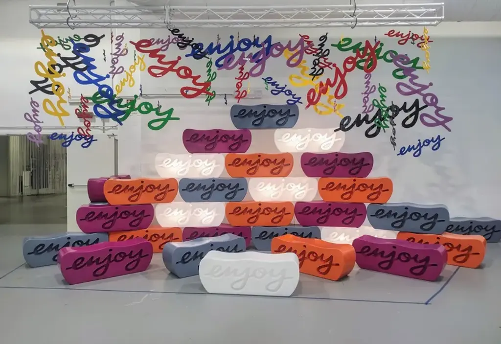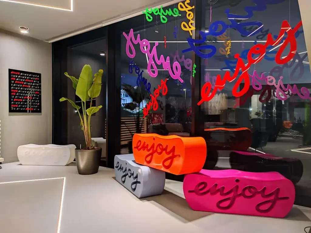 Sinuous, ergonomic and symmetrical, a functional sculpture symbol of happiness: Enjoy is the bench designed by Adriana Lohmann and Giò Colonna Romano, conceived and produced with two seats, because joy must be shared! Enjoy is versatile, ready to bring its wish for the joy of living into indoor and outdoor settings, and transversal: the word in fact reads identically on both sides.