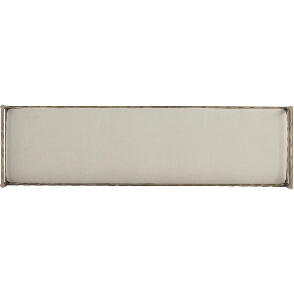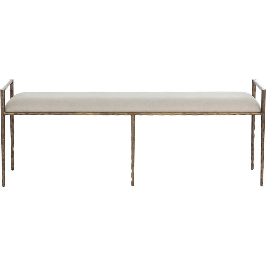 Rich with texture, this impressive bench is infused with an exotic touch. Stocked in zenith taupe grey performance fabric, and completed with a hammered antique brass steel frame. Performance fabric is moisture repellent, durable and easy to clean. Made in India. With refined craftsmanship, this design was brought to life by skilled local artisans. By nature, these materials develop unique imperfections such as fissures, markings and colour variations for a truly one-of-a-kind piece.