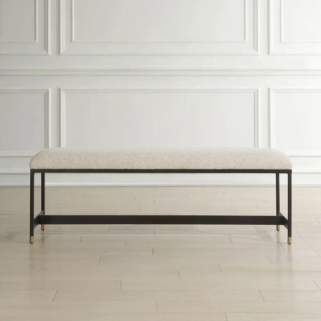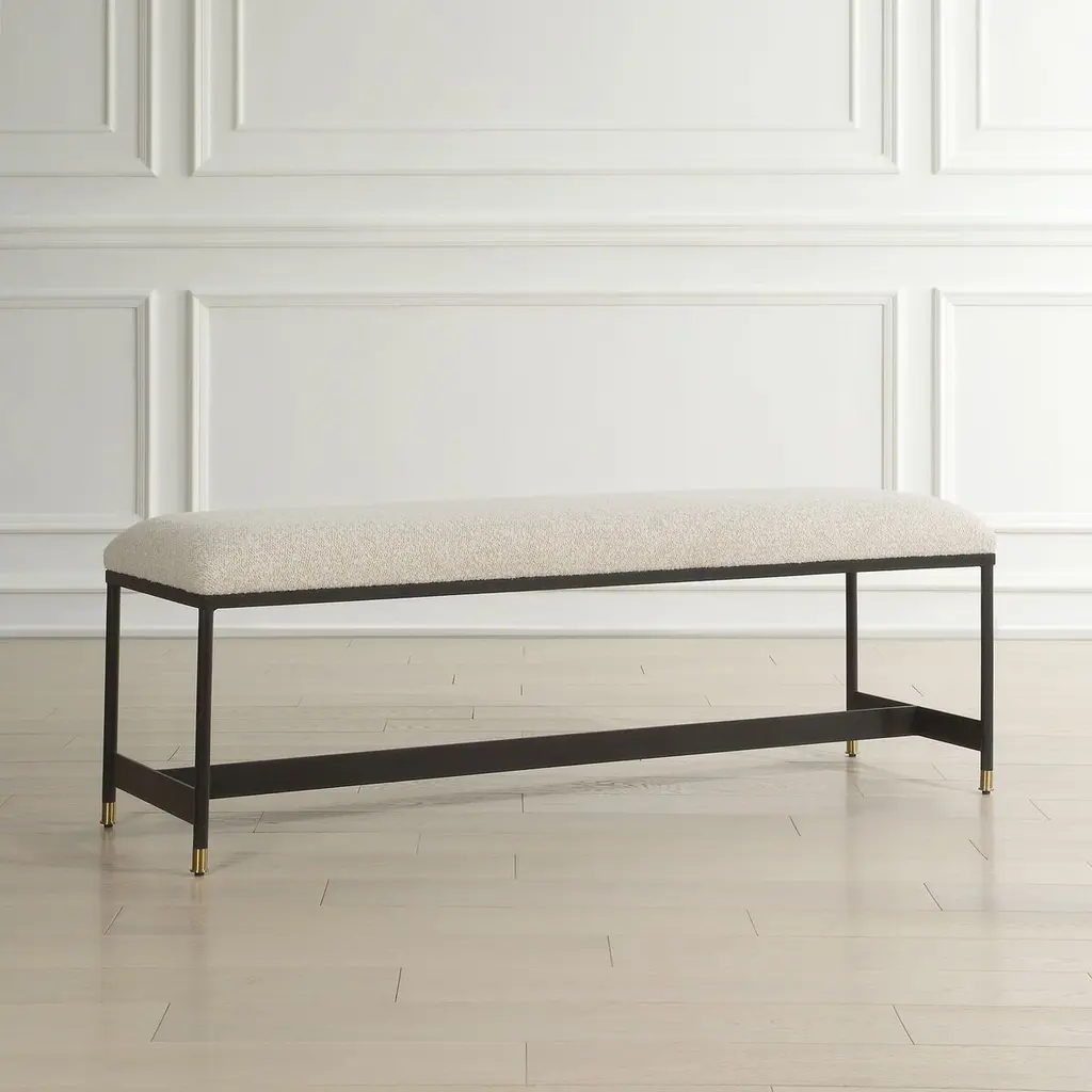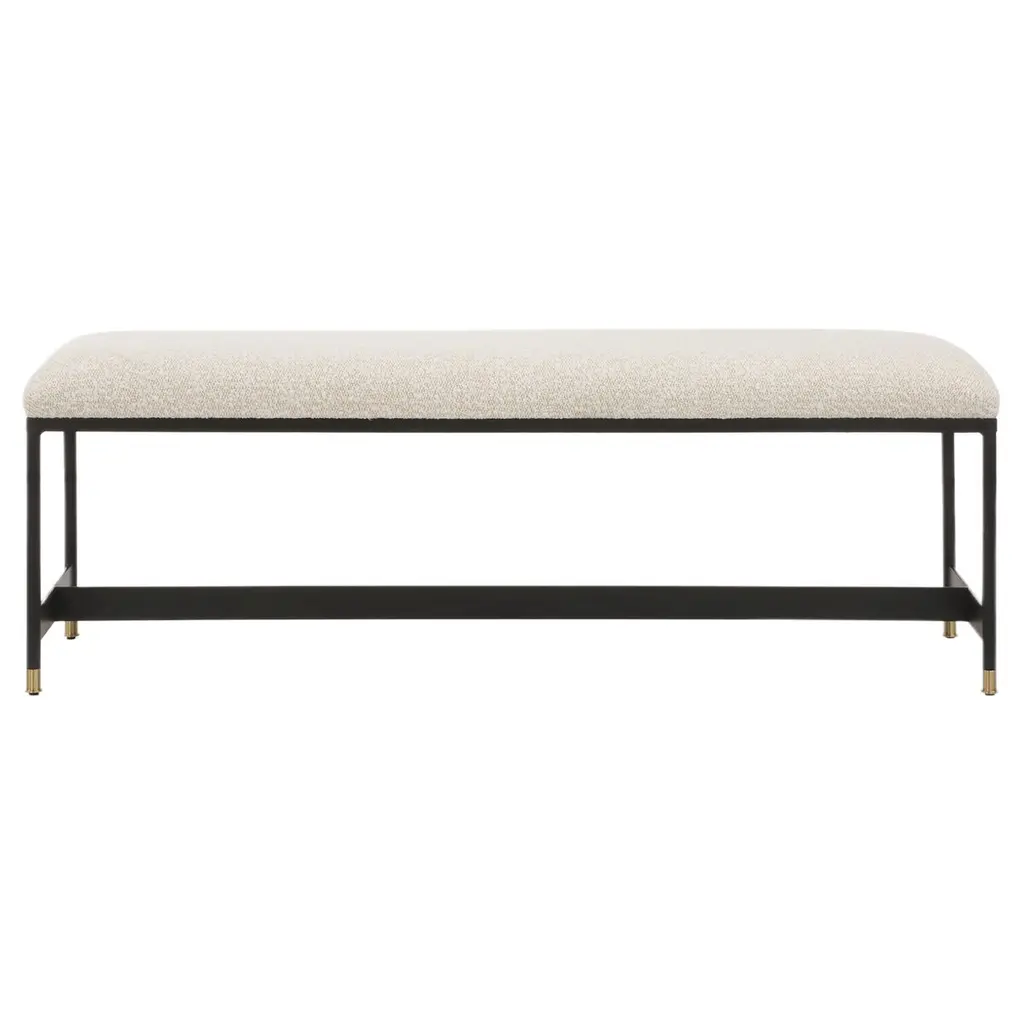 The Estella Bench is a masterpiece of modern elegance, where sleek design meets sumptuous comfort. Its iron frame, with a refined matte finish, exudes a sense of strength and sophistication. The plush upholstered seat invites you to linger, offering a soft embrace with its wool-like texture. Every detail, from the petite brushed brass feet caps to the harmonious blend of materials, speaks of understated luxury. This bench is not just a piece of furniture; it's a statement of style and a promise of comfort, perfect for any space that seeks a touch of romance and refinement.