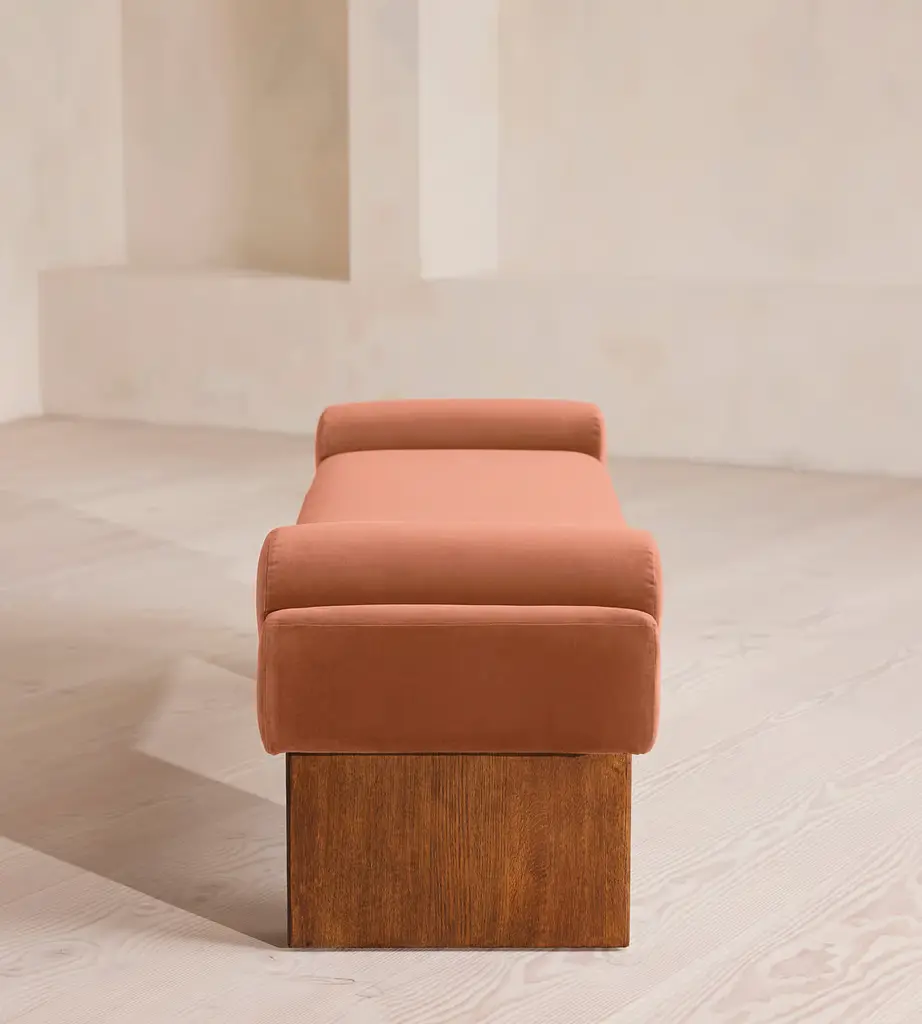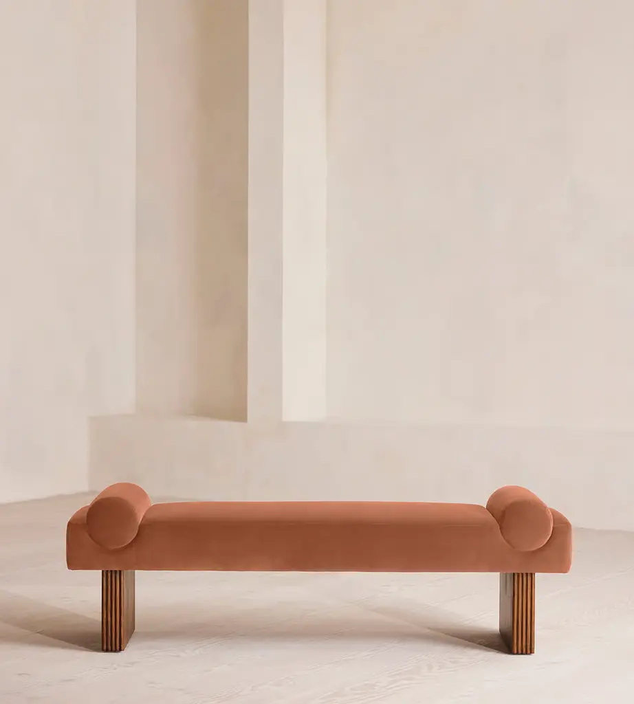 A cushioned velvet seat and solid oak legs defined by ribbed detailing are inspired by our original London House. The Esther bench is inspired by the interiors of our original House at 40 Greek Street. Designed to sit at the end of your bed, its cushioned seat and fixed bolster cushions are fully upholstered in tactile velvet in your choice of bespoke color. At the base, solid oak legs are characterized by intricately carved ribbed detailing.