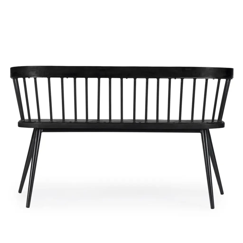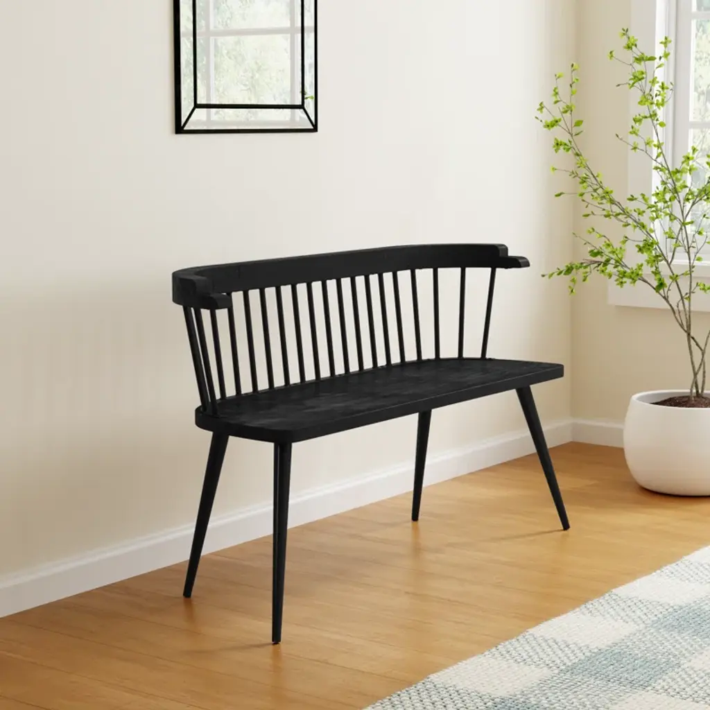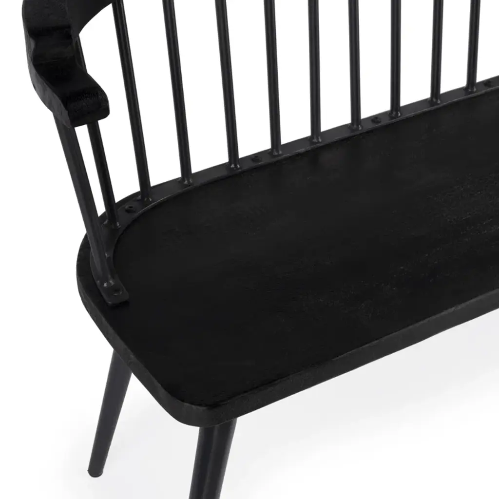 The natural variations of the brown mango wood and black iron frame strike the perfect balance between modern-industrial and rustic design in this eye-catching bench. The delicate spindle back gives this a clean-line silhouette that can comfortably seat two and hold up to 385 lbs.