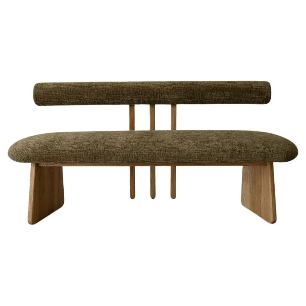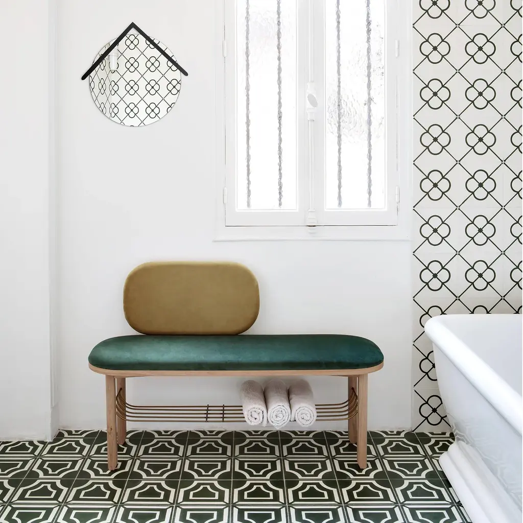 French brand Hartô adds statement-piece seating to its lineup with Eustache. Designed by Margaux Keller, the natural oak bench has an elegant velvet-covered seat with a rounded backrest and stands on carved feet that resemble a ballerina’s pointe shoes. Under the seat, a brushed-brass wire shelf provides convenient storage space to tuck reading matter or other creature comforts.