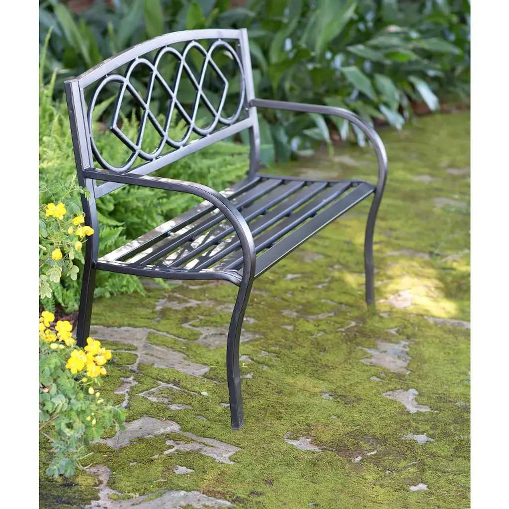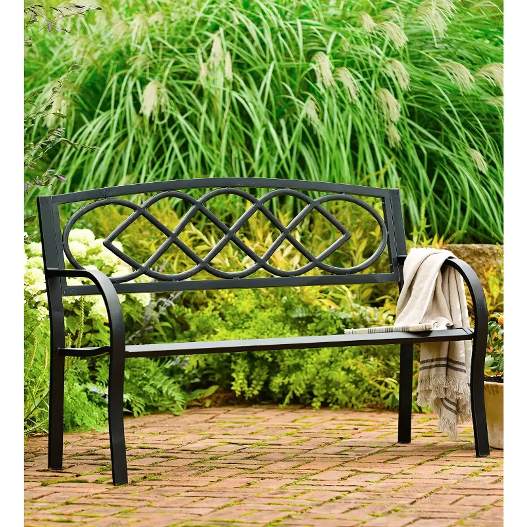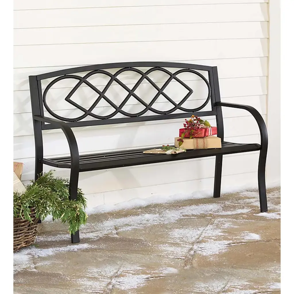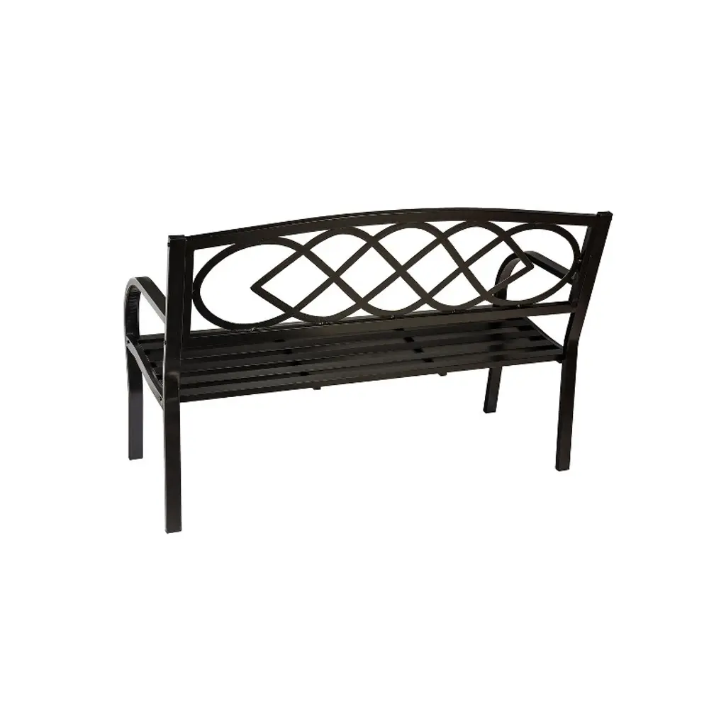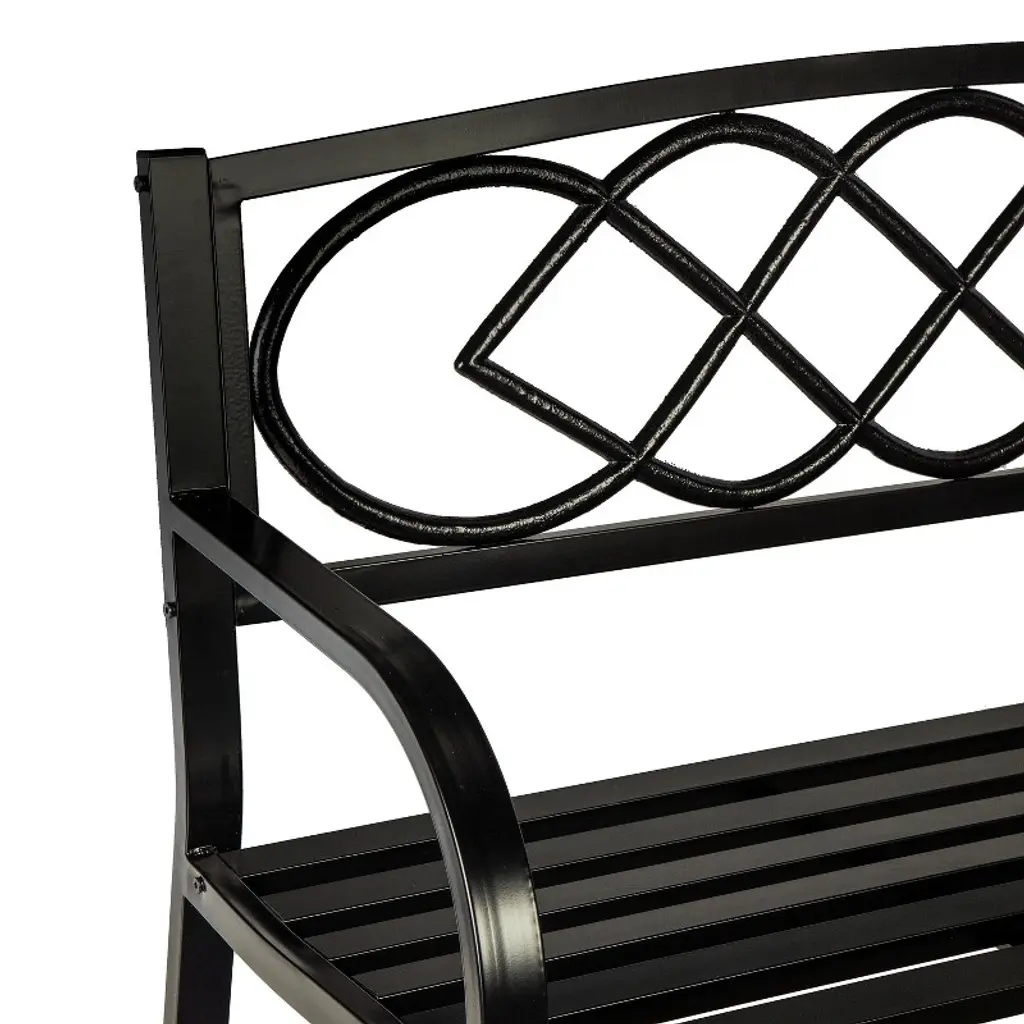 This all-weather steel-frame garden bench features a cast-iron back design with Celtic Knot pattern. The classic black finish with brushed highlights lends a timeless look to any setting. Slatted seat, curved arms and an arched back. 400 lbs limit.