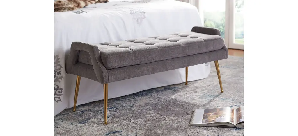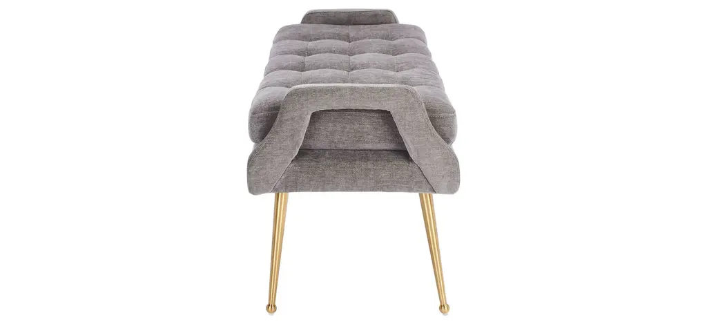 The ideal finishing touch to today's contemporary furnishings, this Everlynn Bench exudes sophistication. Everlynn's silver grey pillow-top cushion and upholstered arms are ultra-soft to the touch, and sleek brushed gold legs elevate its aesthetic prowess. Channel tufted details complete the lavish look.