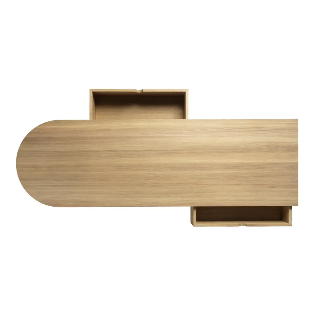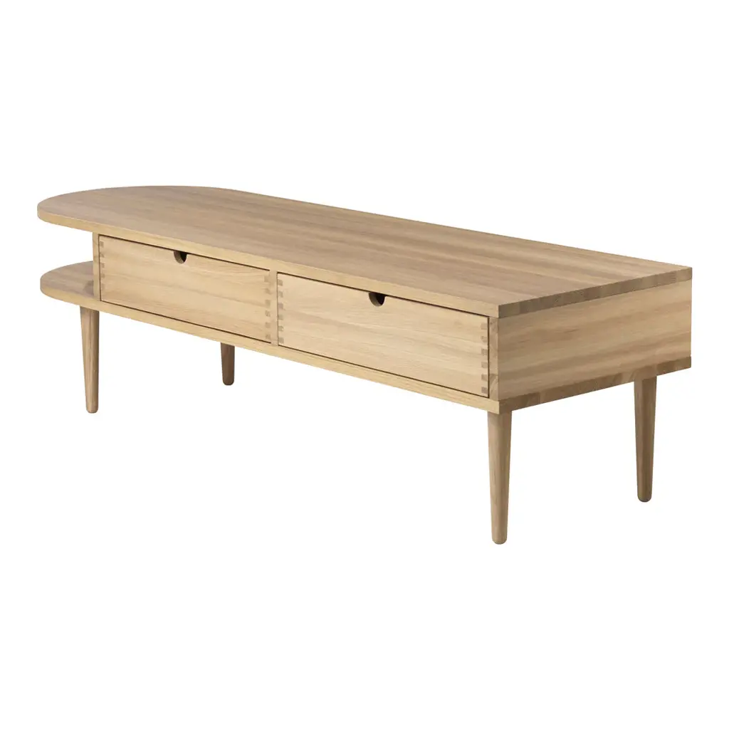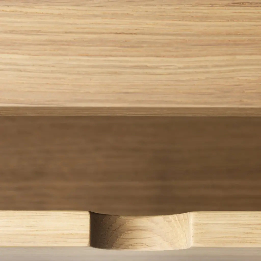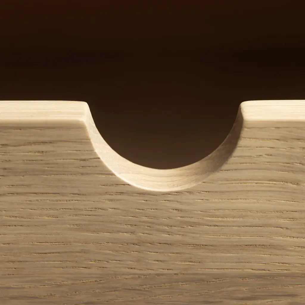 Designed by Mot & Bergstrom, Radius is intended as a flexible bench which can be used for sitting on, but also as a small table with two drawers for storage. The designer duo had the idea of reviving the classic storage bench, but in a minimalist design with clean lines and surfaces. The bench, s part of a series which also includes a smaller bench .Both models are available in black and natural. Cushions can be purchased separately . The solid oak Radius bench is a perfect piece of furniture for the small urban apartment, but is equally suitable for a children's bedroom or a living room. Designed by Mot & Bergstrom, Radius is intended as a flexible bench which can be used for sitting on, but also as a small table with a drawer for storage. The designer duo had the idea of reviving the classic storage bench, but in a minimalist design with clean lines and surfaces. The bench, which is 90 cm wide, 40 cm high and 35 cm deep, is part of a series which also includes a larger Radius bench from 2015. Both models are available in black and natural.