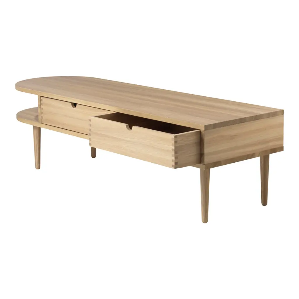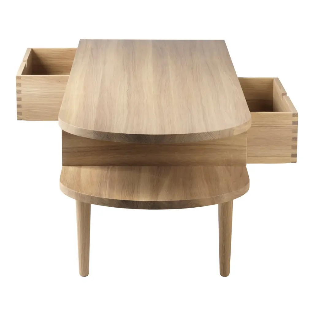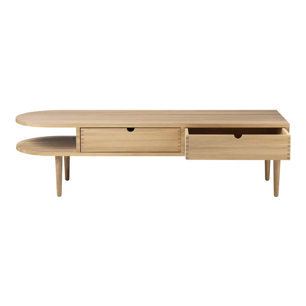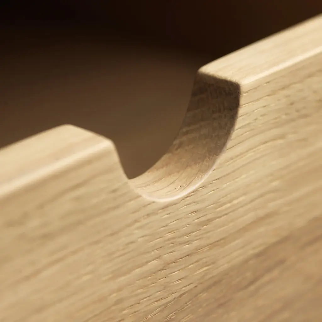 Designed by Mot & Bergstrom, Radius is intended as a flexible bench which can be used for sitting on, but also as a small table with two drawers for storage. The designer duo had the idea of reviving the classic storage bench, but in a minimalist design with clean lines and surfaces. The bench, s part of a series which also includes a smaller bench .Both models are available in black and natural. Cushions can be purchased separately . The solid oak Radius bench is a perfect piece of furniture for the small urban apartment, but is equally suitable for a children's bedroom or a living room. Designed by Mot & Bergstrom, Radius is intended as a flexible bench which can be used for sitting on, but also as a small table with a drawer for storage. The designer duo had the idea of reviving the classic storage bench, but in a minimalist design with clean lines and surfaces. The bench, which is 90 cm wide, 40 cm high and 35 cm deep, is part of a series which also includes a larger Radius bench from 2015. Both models are available in black and natural.