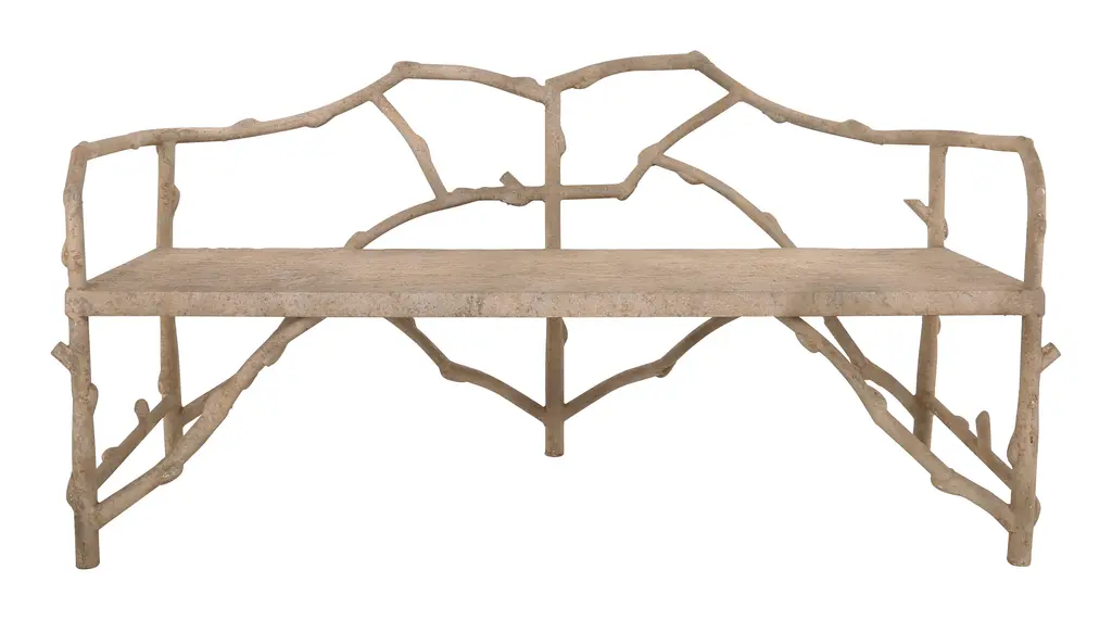 Make a statement with this metal faux branch motif accent bench. Featuring a heavily textured antiqued silver finish and tailored in an off-white polyester woven fabric over foam cushion. This beauty weighs in at 26 pounds! Goes anywhere. Can go in the lodge or in the condo. Upstairs or downstairs. Can look rustic or contemporary. 24 W X 20 H X 16 D (in)