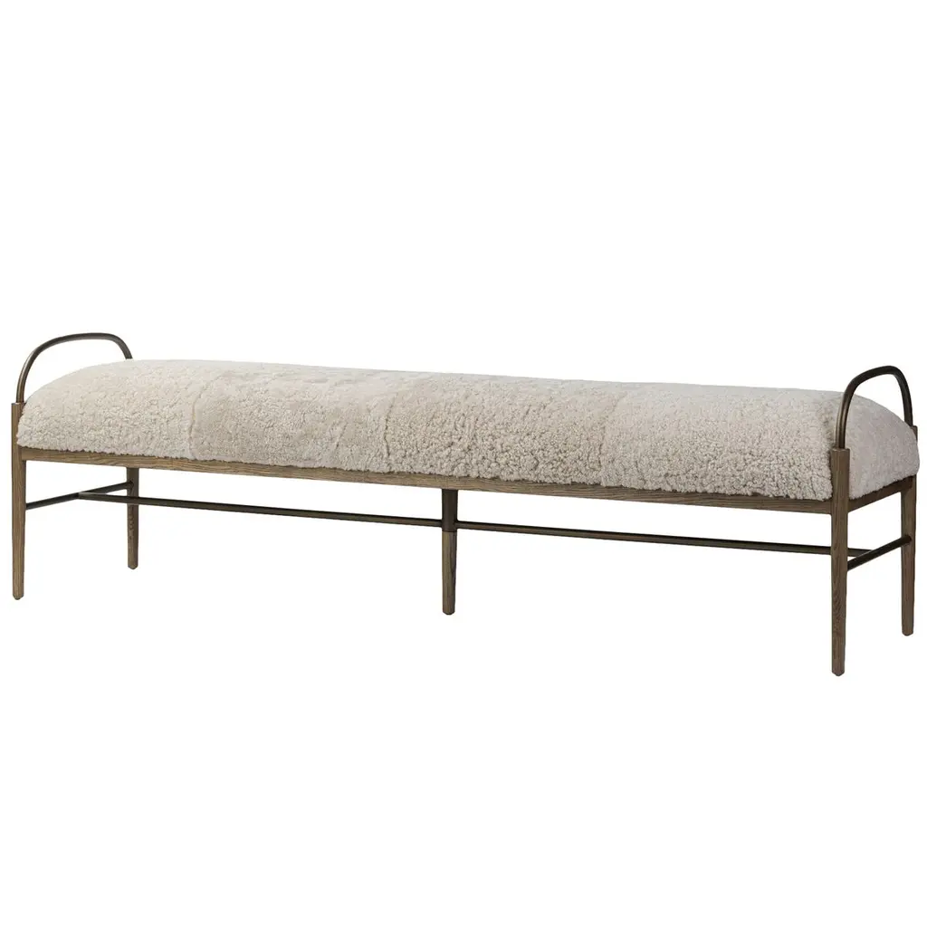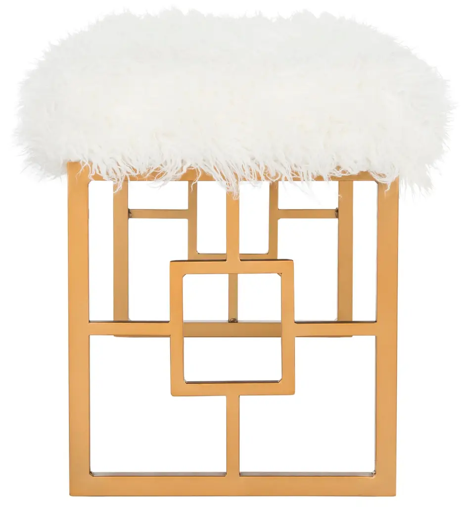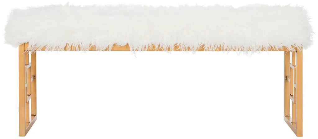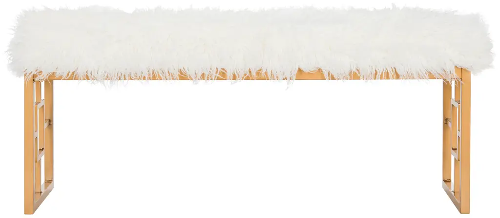 Designed for the graceful interior, the Faux Sheepskin bench pairs lavish white faux curly sheepskin with a liquid gold finish that illuminates the bench’s luxurious cut-out detail. Use in the foyer for a grand entry or as the most coveted seat in the living room. Dust regularly with a soft, dry cloth. Never use oiled or treated cloths on lacquered finishes. Some finishes can be wiped with a damp (not wet) cloth, followed at once by rubbing with a dry cloth to remove fingerprints and smudges. For persistent spots, gently clean with a soft cloth and a solution of water and mild soap, make sure to wipe dry. Use adhesive felt pads, coasters and placemats to protect your furniture. Some assembly required.