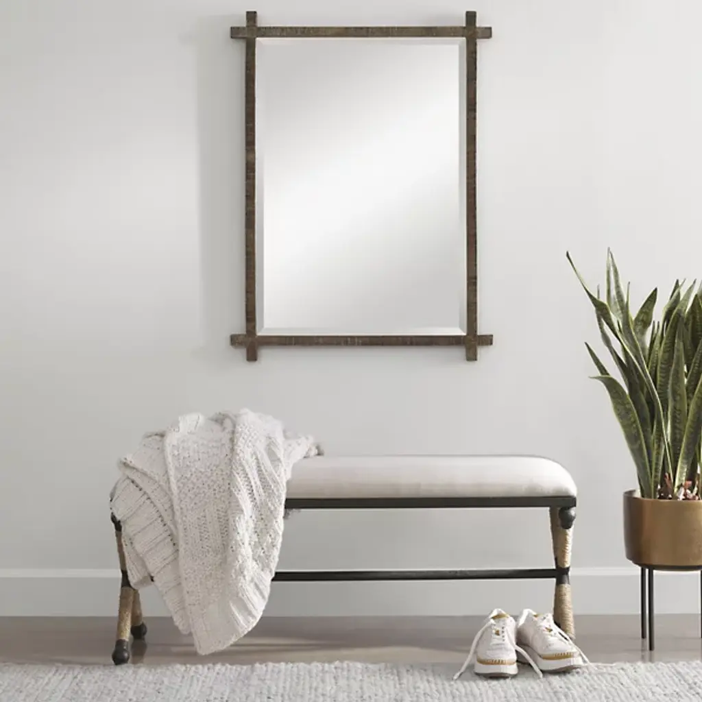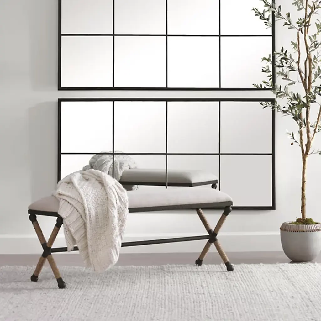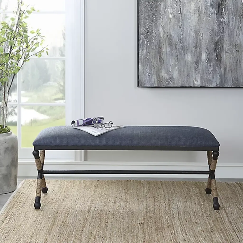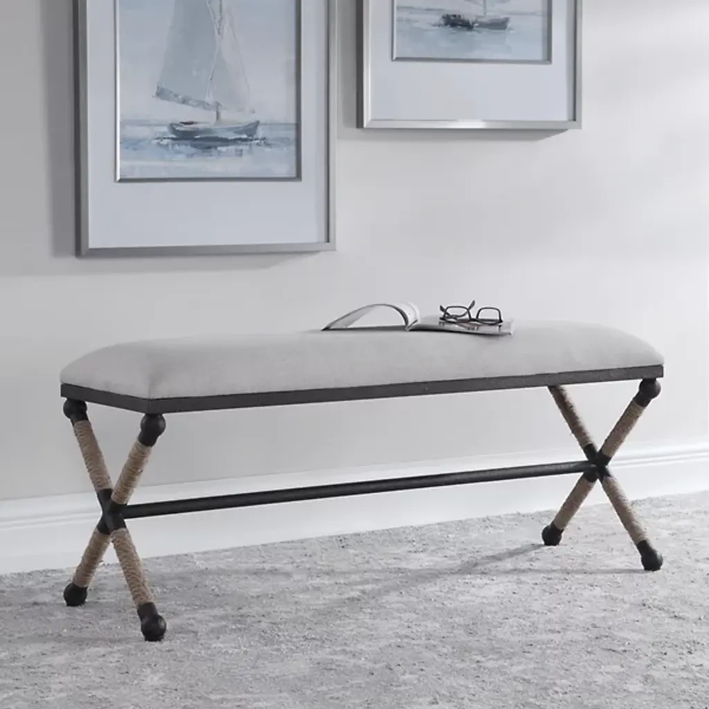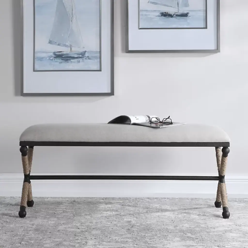 The Firth Bench from Uttermost is a versatile piece designed by Grace Feyock. This bench seamlessly blends coastal and nautical styles and Bohemian charm. Crafted precisely, Firth features a robust frame of durable iron, offering stability. The frame is thoughtfully accented with rope details, adding texture. The upholstery is a blend of materials, combining polyester, cotton, and flax for a soft and comfortable feel. The generously padded seat, filled with high-quality foam, forms a supportive surface.