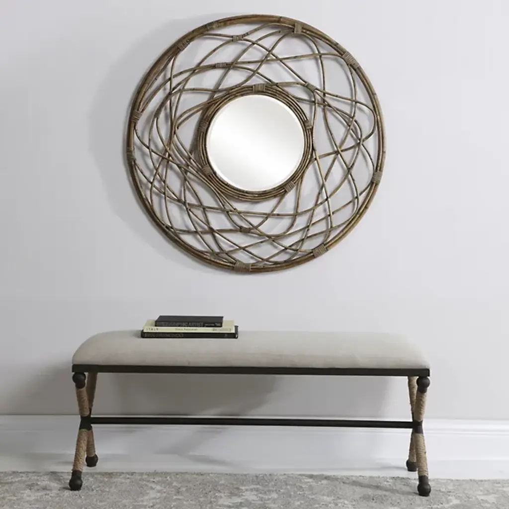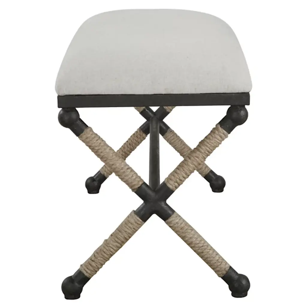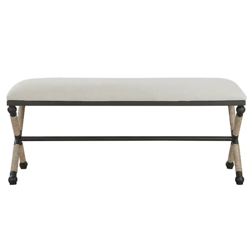 The Firth Bench from Uttermost is a versatile piece designed by Grace Feyock. This bench seamlessly blends coastal and nautical styles and Bohemian charm. Crafted precisely, Firth features a robust frame of durable iron, offering stability. The frame is thoughtfully accented with rope details, adding texture. The upholstery is a blend of materials, combining polyester, cotton, and flax for a soft and comfortable feel. The generously padded seat, filled with high-quality foam, forms a supportive surface.
