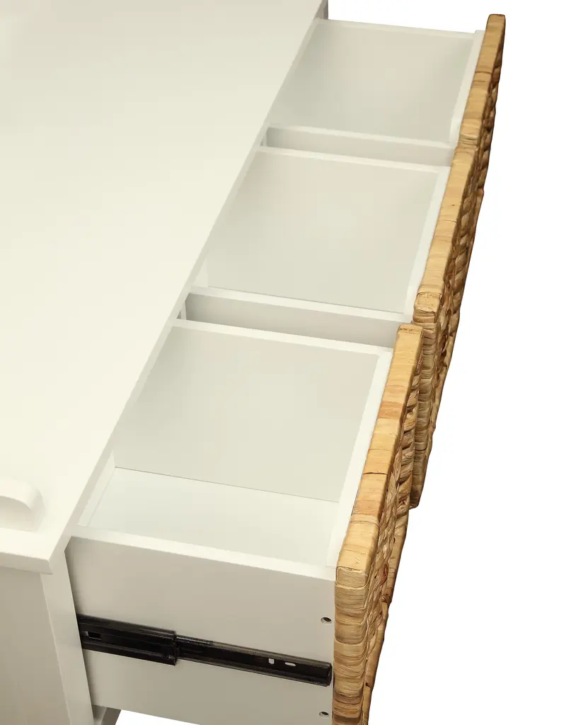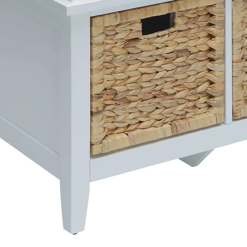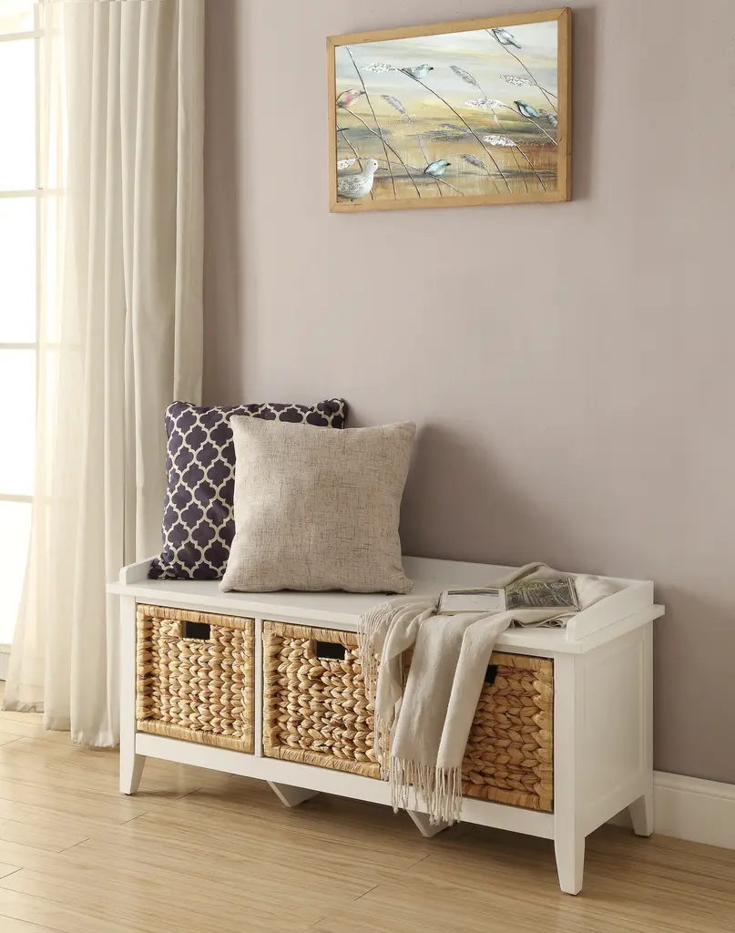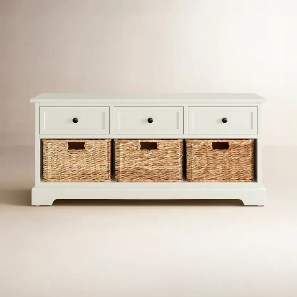 Rectangular Bench•3 Drawers, Wooden Seat & Frame, KD Drawer, Basket Front Drawer: Glide Side Metal. Material: Wood Leg (Solid Wood), Wood Veneer, MDF, Basket Front. Stationary• Drawer Size: 12" x 11" x 12"H (Inner 10" x 11" x 9"H). Style: Transitional
