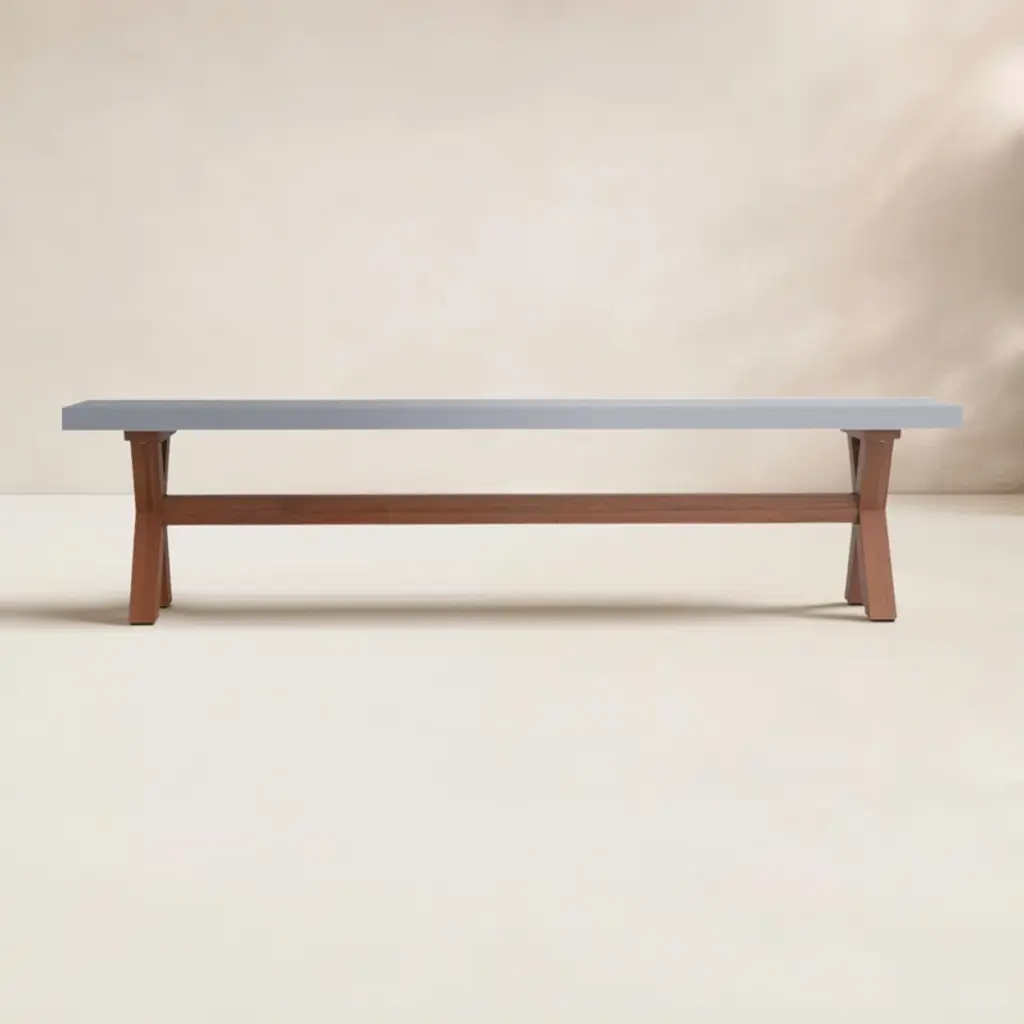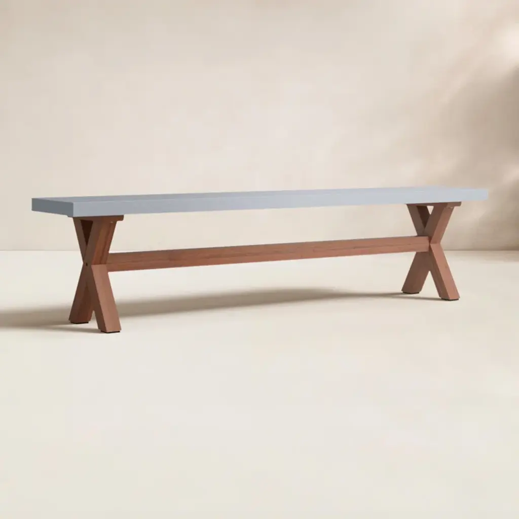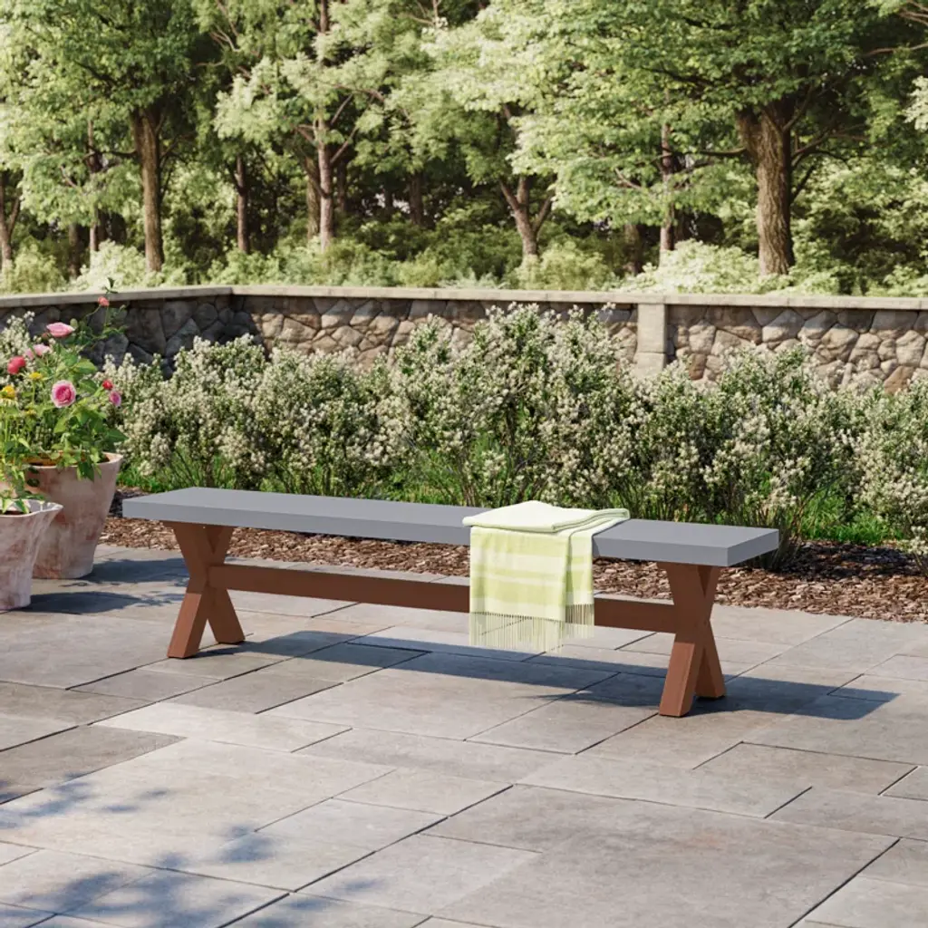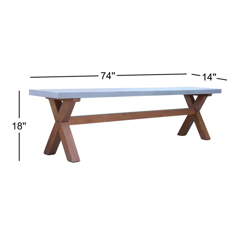 Host outdoor BBQs and family get-togethers with this bench pulled up to your table. It's crafted from solid eucalyptus wood in a warm brown finish that shows off the natural grain variation. X-shaped legs and a horizontal stretcher provide ample support, while a textured polyresin top is coated with powdered concrete. Water-, rust-, and UV-resistant, this bench stands up to the elements and accommodates up to three people.