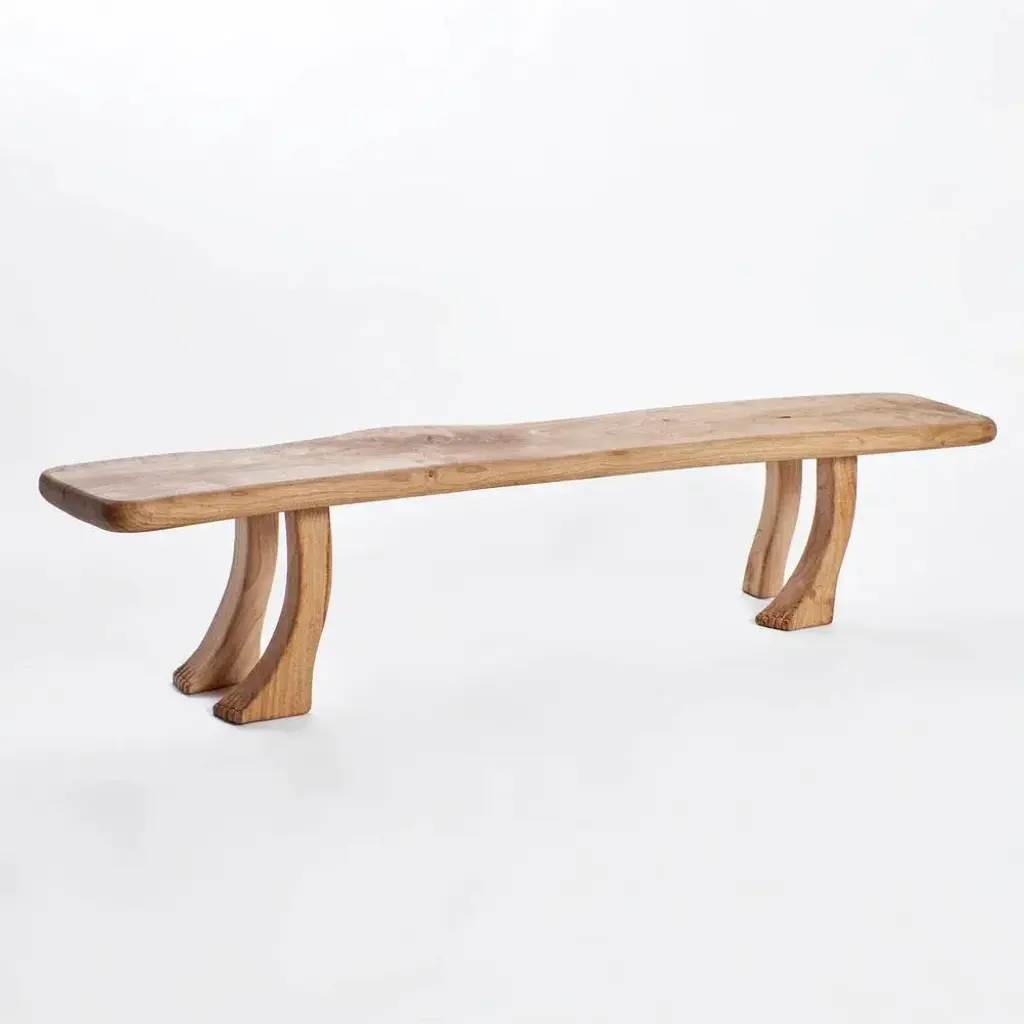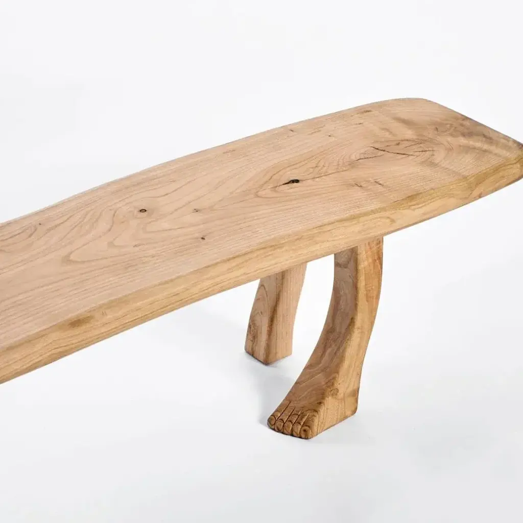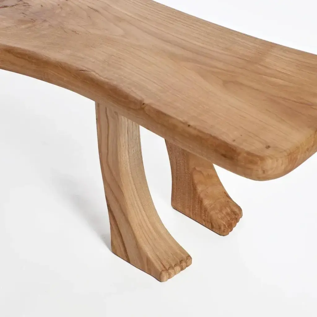 Foot bench by project 213a dimensions: w 140 x d 27 x h 30 cm materials: chestnut this playful design is part of project 213a's hand carved wooden "foot series"; inspired by a classic milking stool, this bench comes with three foot shaped legs and one uneven leg. The bench is hand carved by artisans in northern portugal from chestnut wood and oil finished to have a smooth finished.
