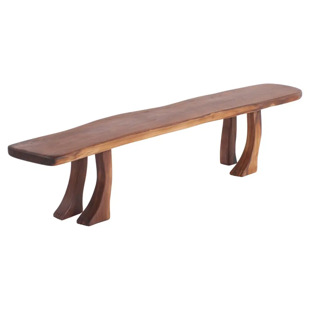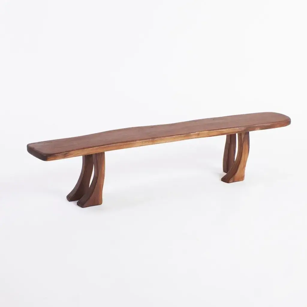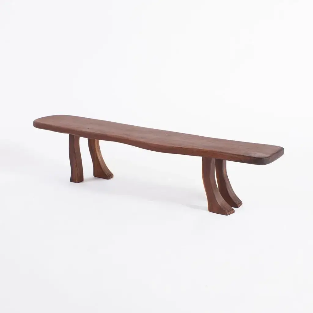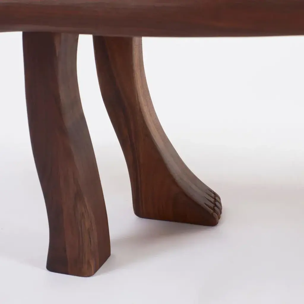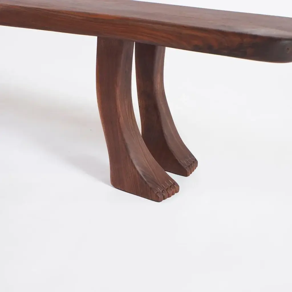 Foot walnut bench by project 213a dimensions: w 140 x d 27 x h 30 cm materials: walnut this playful design is part of project 213a's hand carved wooden "foot series"; inspired by a classic milking stool, this bench comes with three foot shaped legs and one uneven leg. The bench is hand carved by artisans in northern portugal from chestnut wood and oil finished to have a smooth finished.