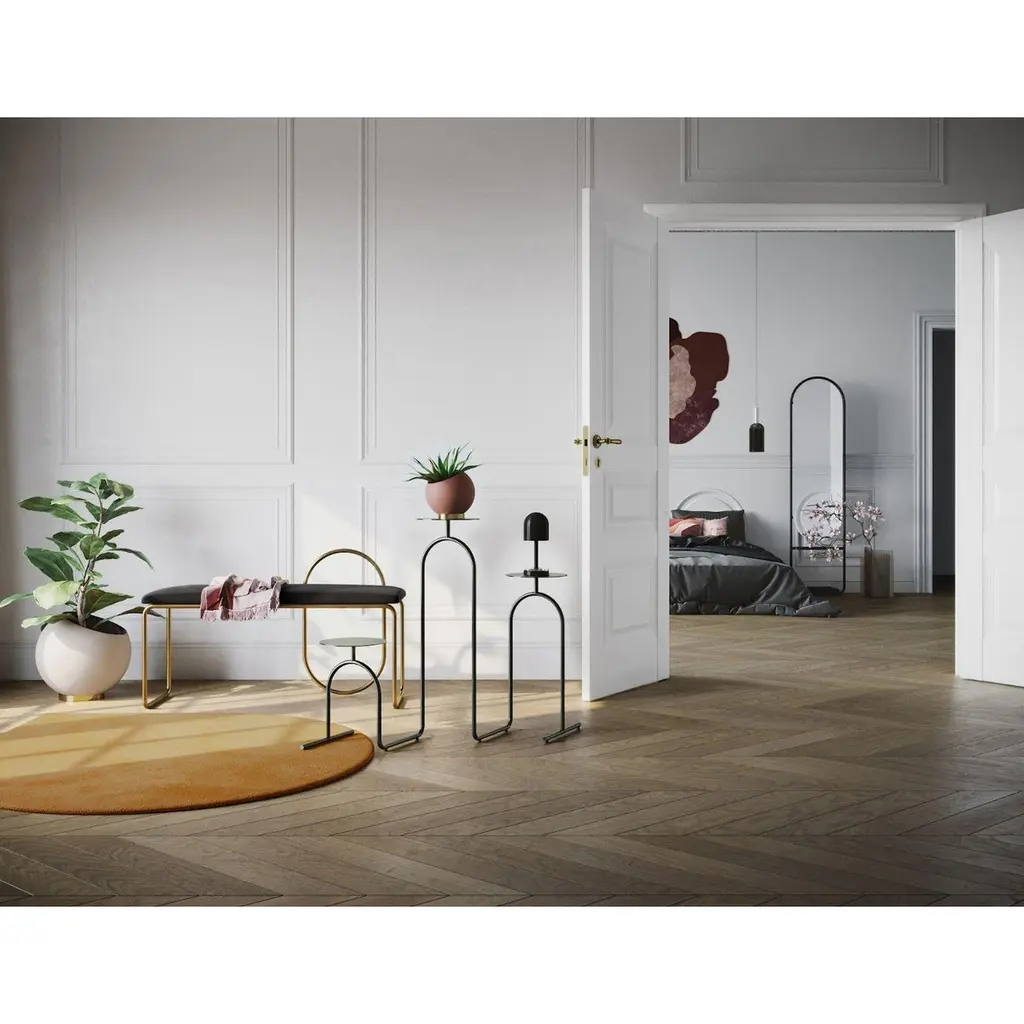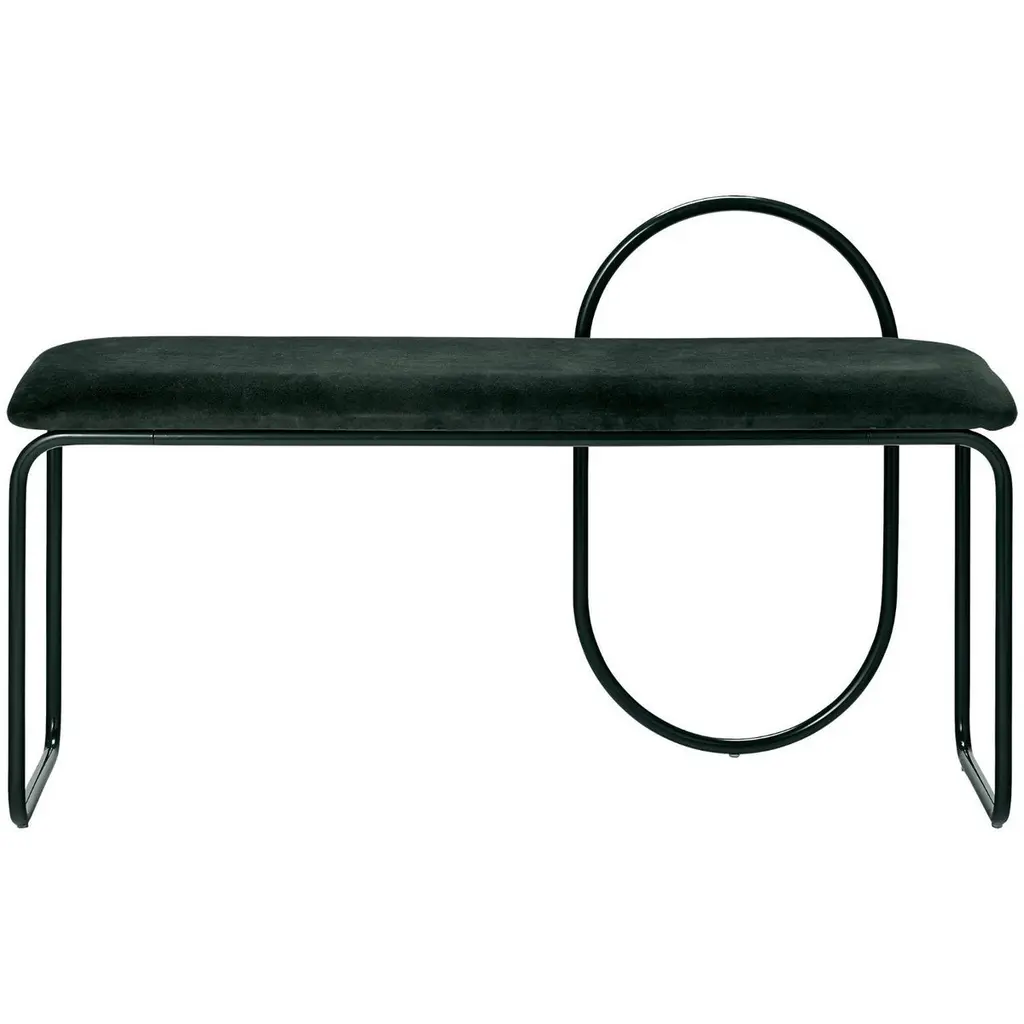 Forest velvet Minimalist bench Dimensions: L 110 x W 39 x H 68 CMMaterials: Cotton velvet, steelThe collection includes benches, chairs, shelves and mirrors in a wide variety of sizes.