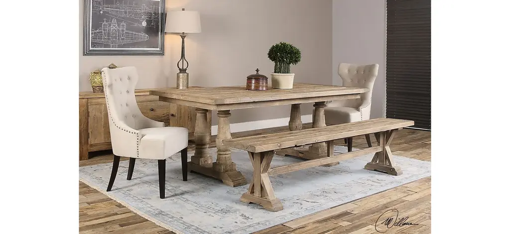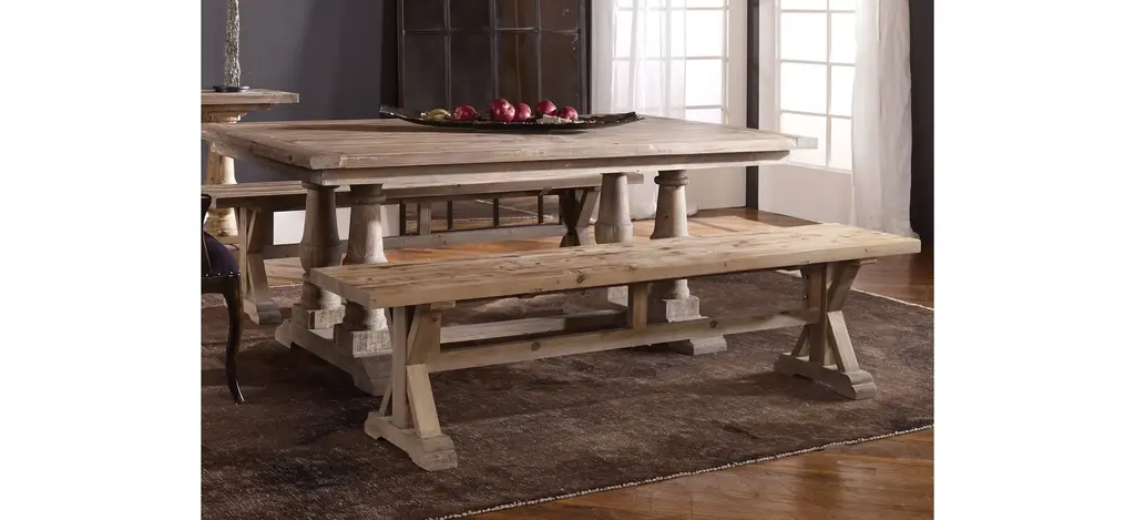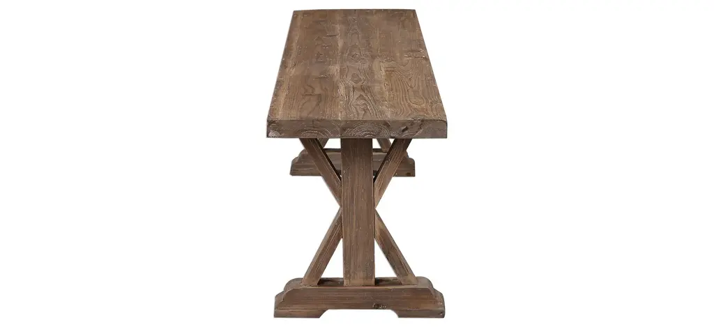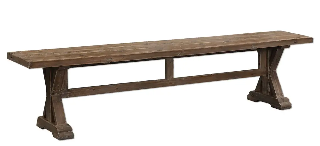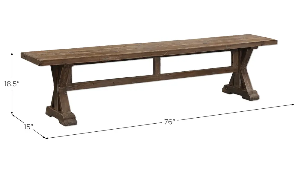 The Freeport Bench is solidly constructed of salvaged fir lumber with a carved trestle base. Sun faded and distressed patina is finished with a stony gray wash. Solid wood will continue to move with temperature and humidity changes, which can result in small cracks and uneven surfaces, adding to its authenticity and character.