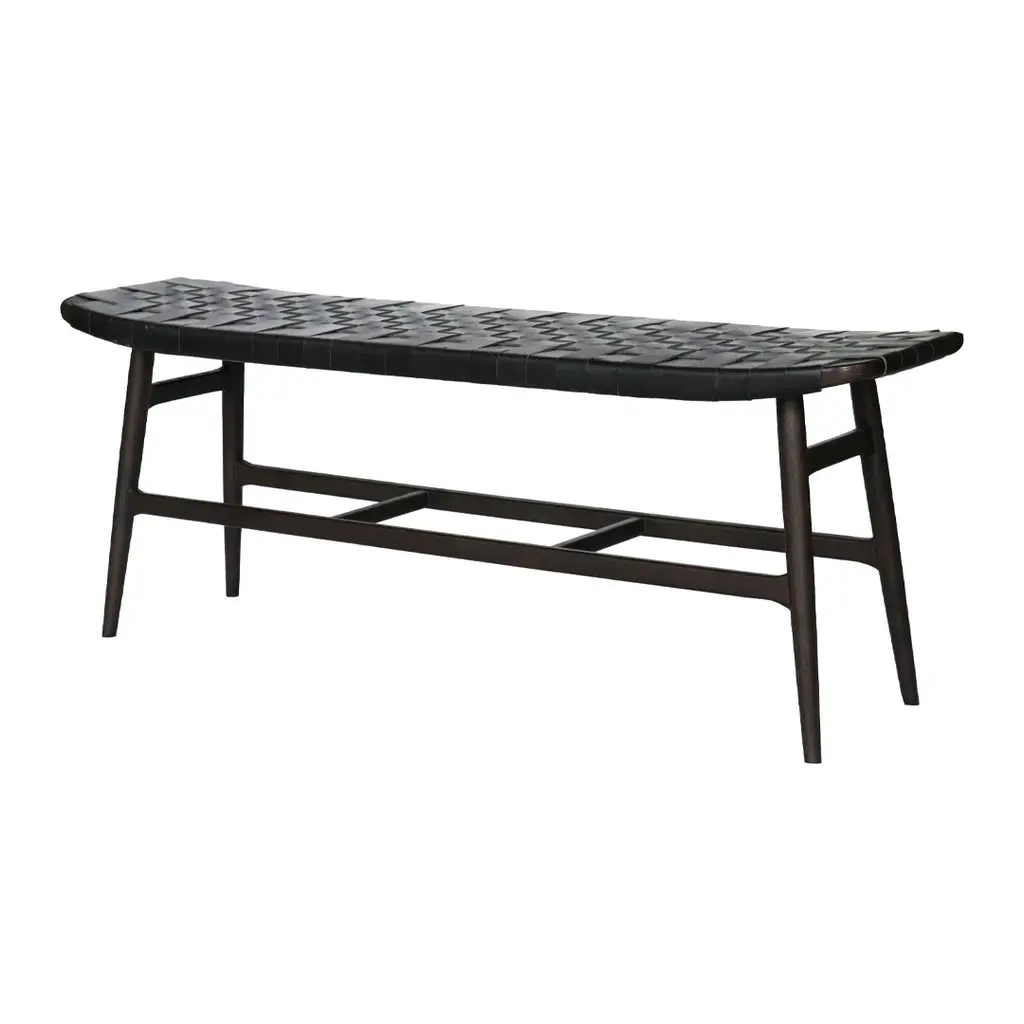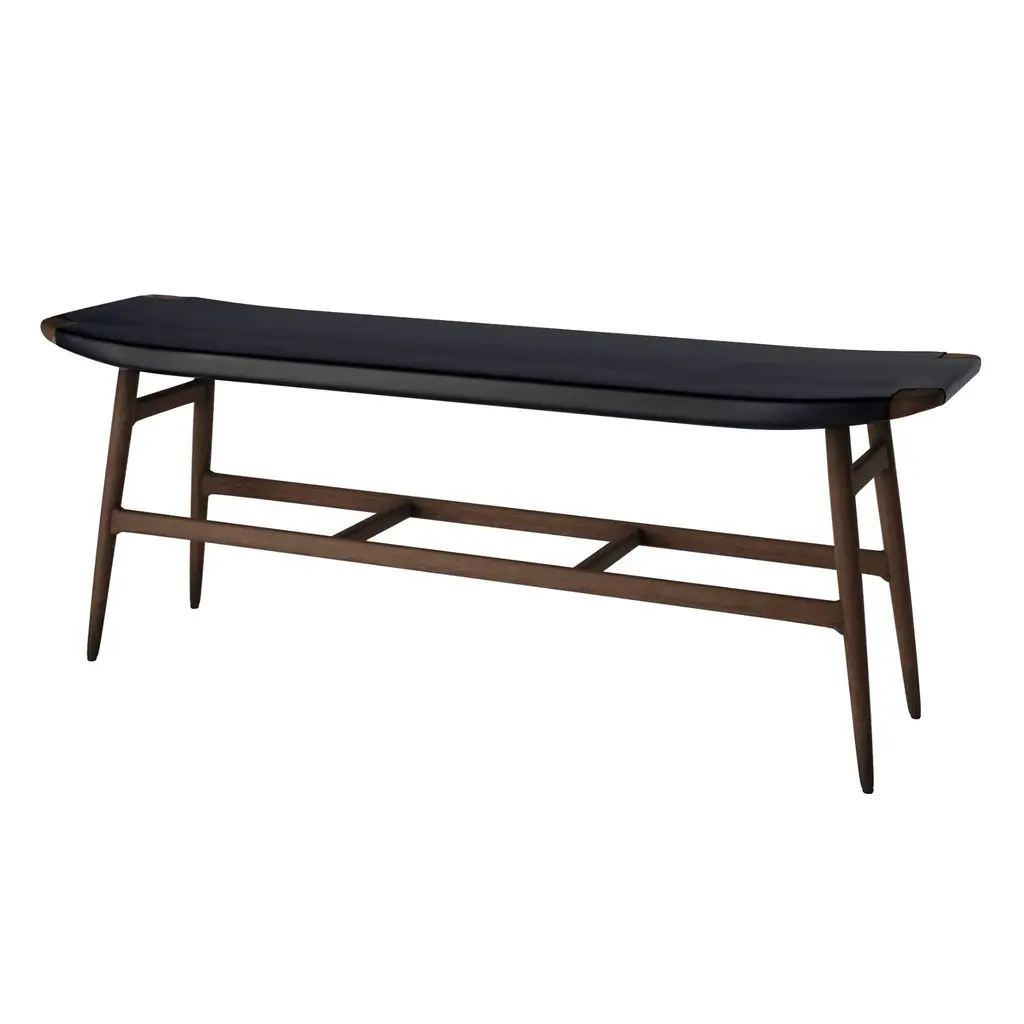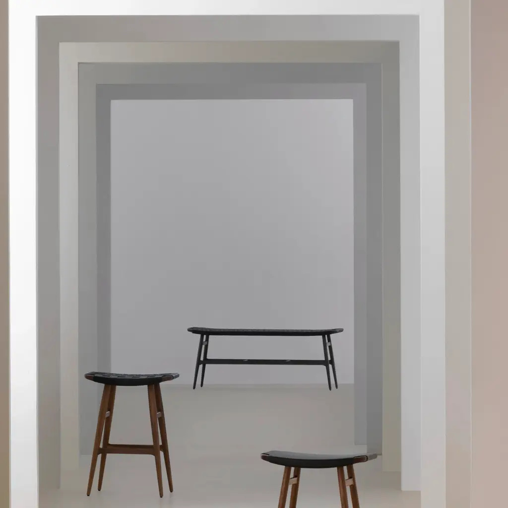 Designers Signe Bindslev Henriksen and Peter Bundgaard Rützou extend Stellar Works’s Freja stool as a handsome bench. The Space Copenhagen duo conceives the collection as sculptural furniture with the soothing visual appeal of Scandinavian woodcraft traditions and a quiet Japanese minimalism. Expertly rendered in solid oak or walnut in a choice of finishes, the angled-leg bench gains further character from the range of seat selections in either solid or woven leather.