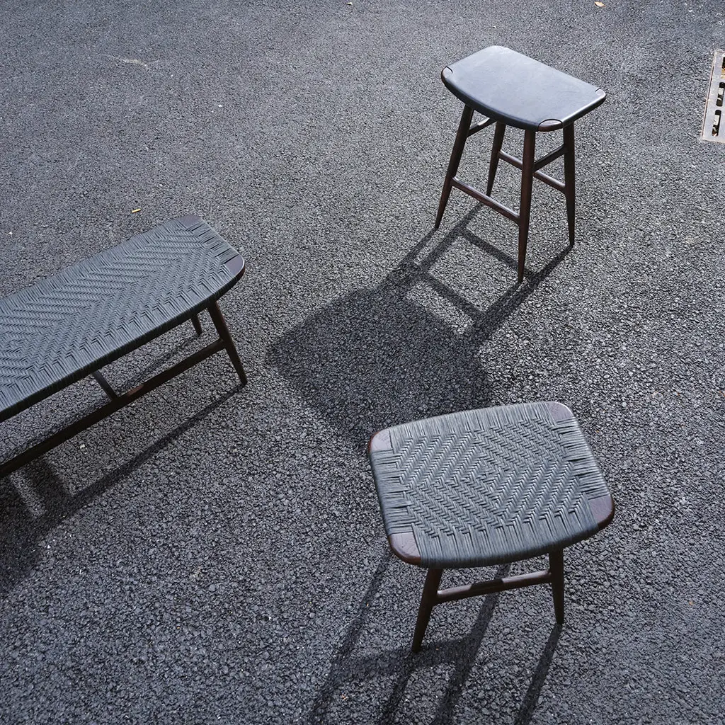 Freja is a collection of stools and bench that comes out of a wish to create sculptural furniture with the soothing visual appeal of Scandinavian furniture making traditions and a Japanese mode of expression. The archetypal furniture making principles of static and ornament converge to give Freja its elegant, yet simple character. Seen from different angles legs and aprons optically interweave to form a trellis, the seat floating lightly with either woven paper cord or leather as only decorative feature.