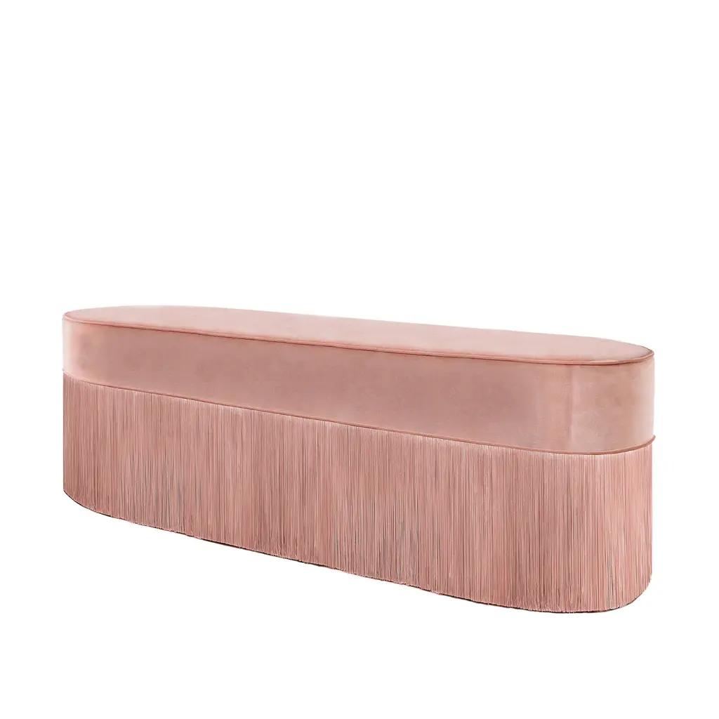 Feminine and glamorous, this superb bench is the perfect element to flank a double bed's end for adding a dash of romanticism to the whole room. An elegant shade of antiqued pink is the one selected for its extra-soft velvet seat, which seals the sturdy beech structure concealed behind an array of pink viscose fringes unmistakably stating the piece's stylish allure. Each bespoke piece is stamped on the bottom of the pouf’s lining and personally signed, numbered, and dated by designer.