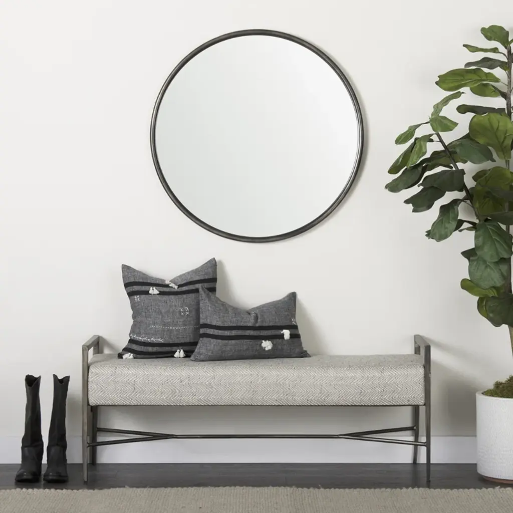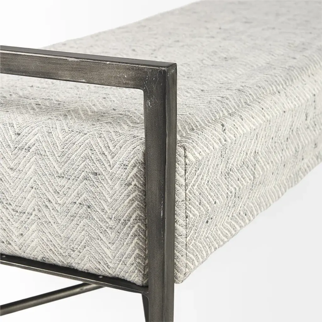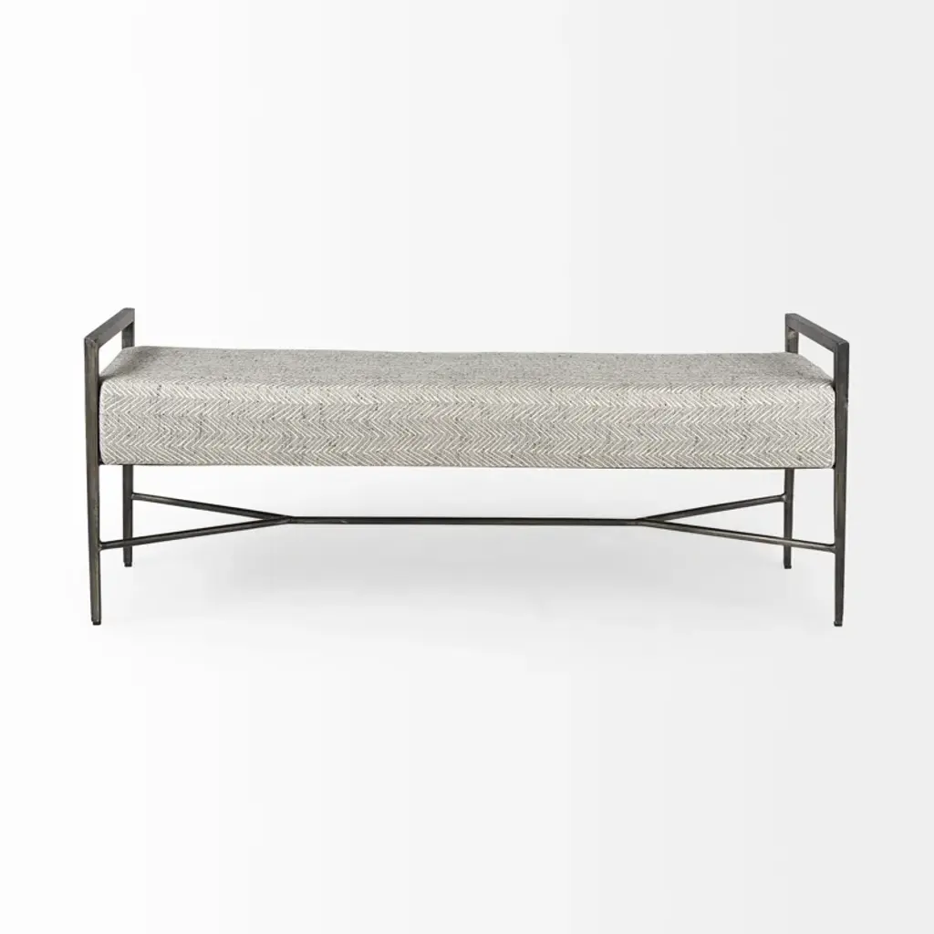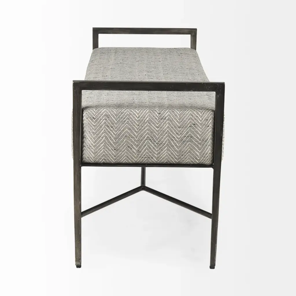 The Genevieve is a fabric and metal bench finished in a black or brass color