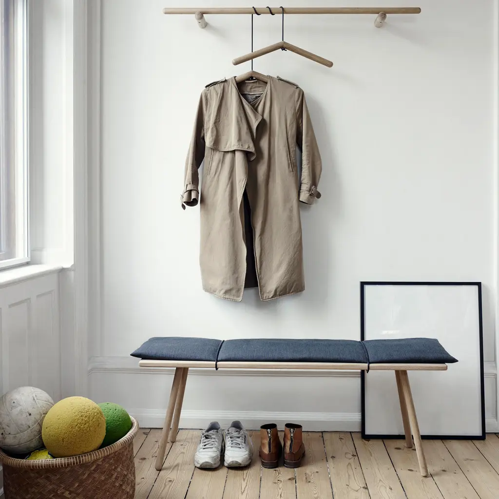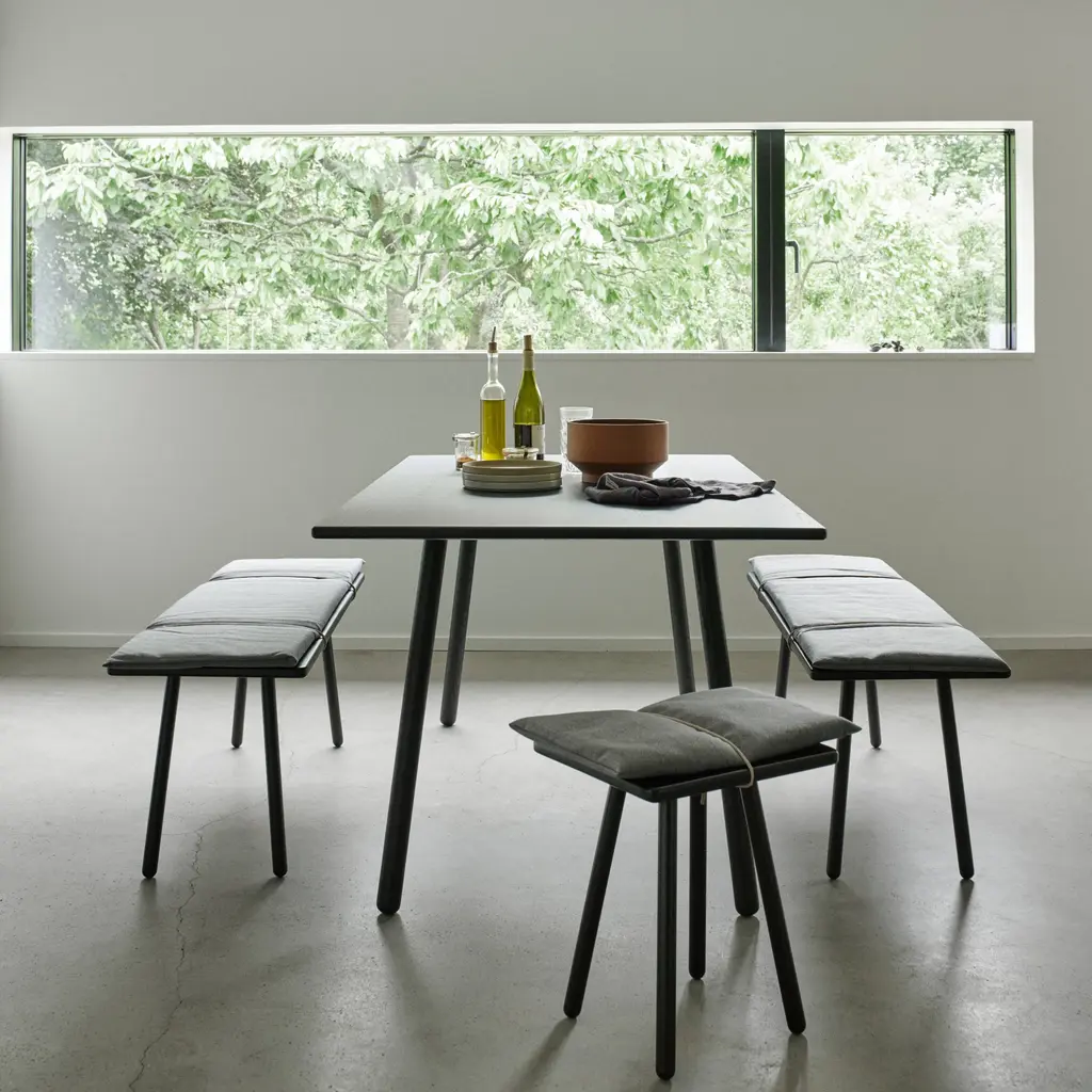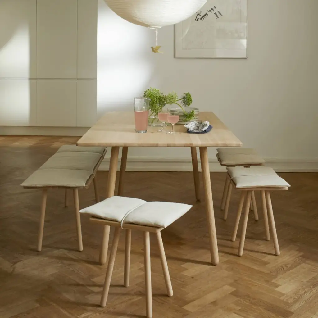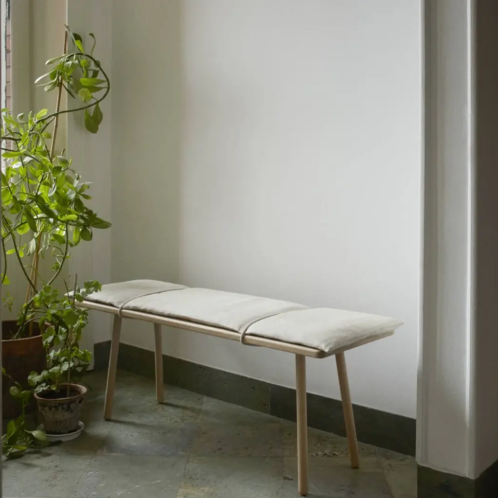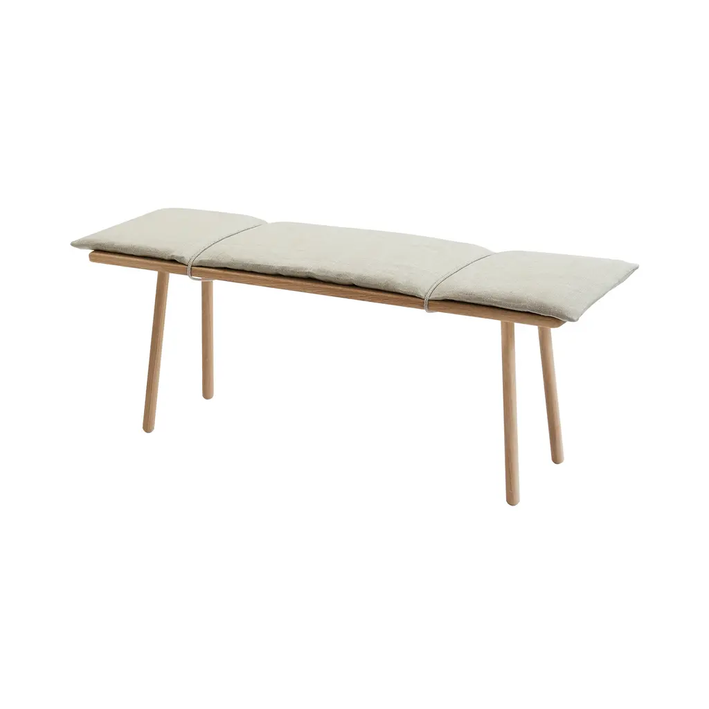 Designer Chris Liljenberg Halstrøm melds a Nordic sensibility with Japanese influences in her mixed-media bench. Georg takes form on slender wooden legs and is beautifully crafted with rounded edges in FSC-certified oak. An invitingly soft woolen cushion is held in place with simple braided leather straps for an unexpected fillip.