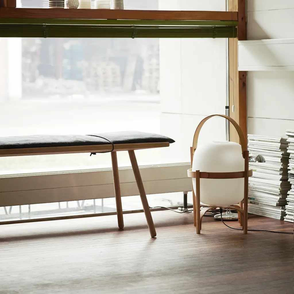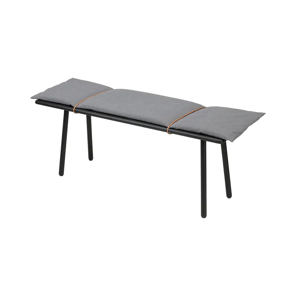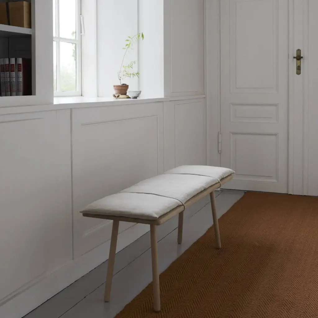 Designer Chris Liljenberg Halstrøm melds a Nordic sensibility with Japanese influences in her mixed-media bench. Georg takes form on slender wooden legs and is beautifully crafted with rounded edges in FSC-certified oak. An invitingly soft woolen cushion is held in place with simple braided leather straps for an unexpected fillip.