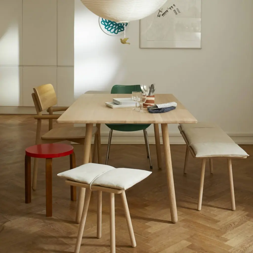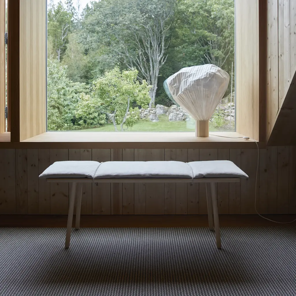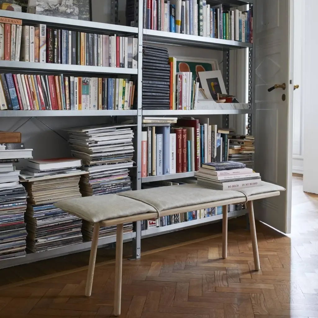 Designer Chris Liljenberg Halstrøm melds a Nordic sensibility with Japanese influences in her mixed-media bench. Georg takes form on slender wooden legs and is beautifully crafted with rounded edges in FSC-certified oak. An invitingly soft woolen cushion is held in place with simple braided leather straps for an unexpected fillip.