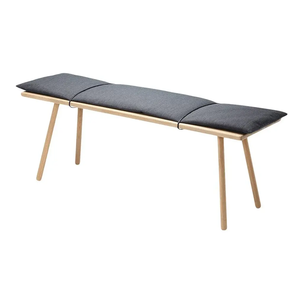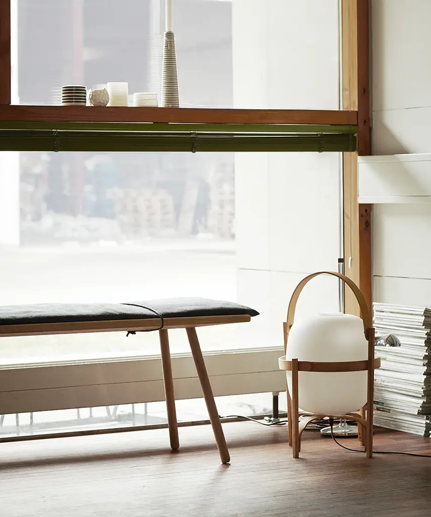 Japanese and nordic sensibilities meet in the minimalist Georg series. The design is characterized by the slender wooden poles and soft surface, where a woolen cushion is kept in place by a braided leather strap. Designed by Chris Liljenberg Halstrøm and manufactured by Skagerak, a family-owned design company from Denmark established in 1976.
