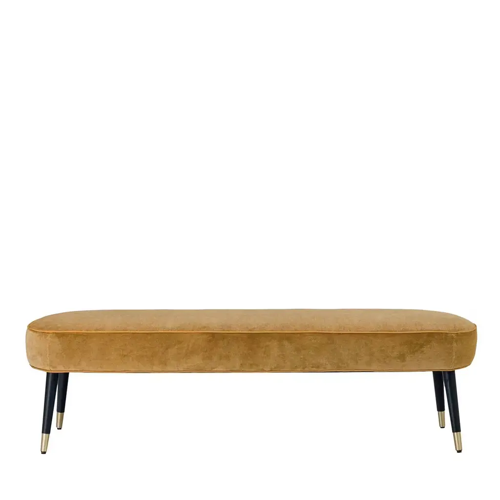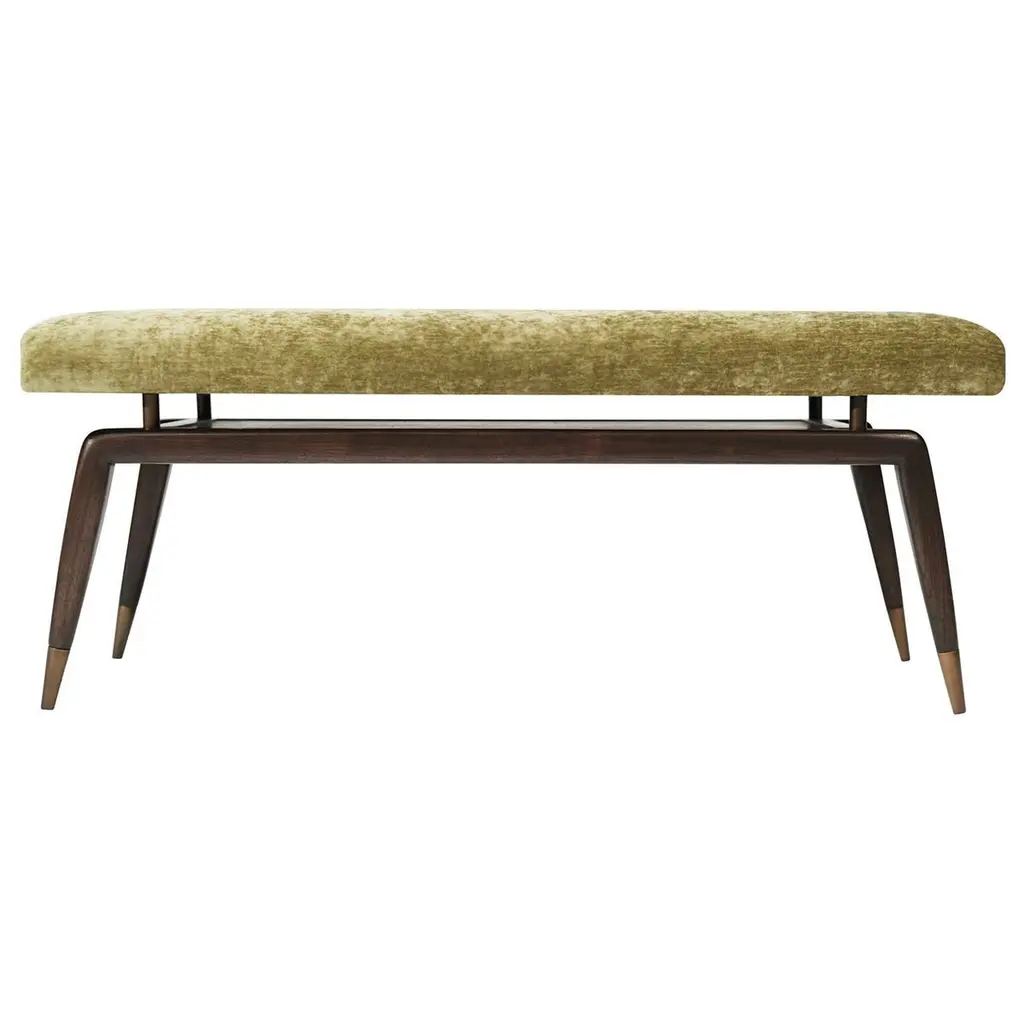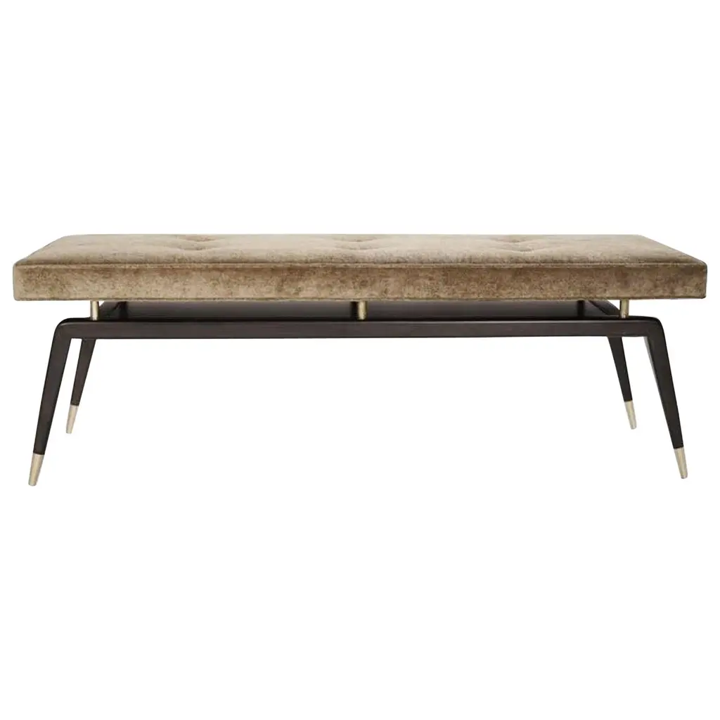 A chic accent piece that will fit harmoniously in any setting, this bench conveys a sense of timeless elegance. Skillfully balanced between classic and modern designs, this piece is pleasing to the eyes and to the touch with its padded seat upholstered with soft velvet fabric in light taupe and contrasting brown piping. The flared, conical legs are made of ebonized wood and are accented with bronzed metal ferules. The ideal companion to the Giglio sofa, this bench becomes a functional surface to display decorative trays with plants, flowers or candles. Cushions not included.