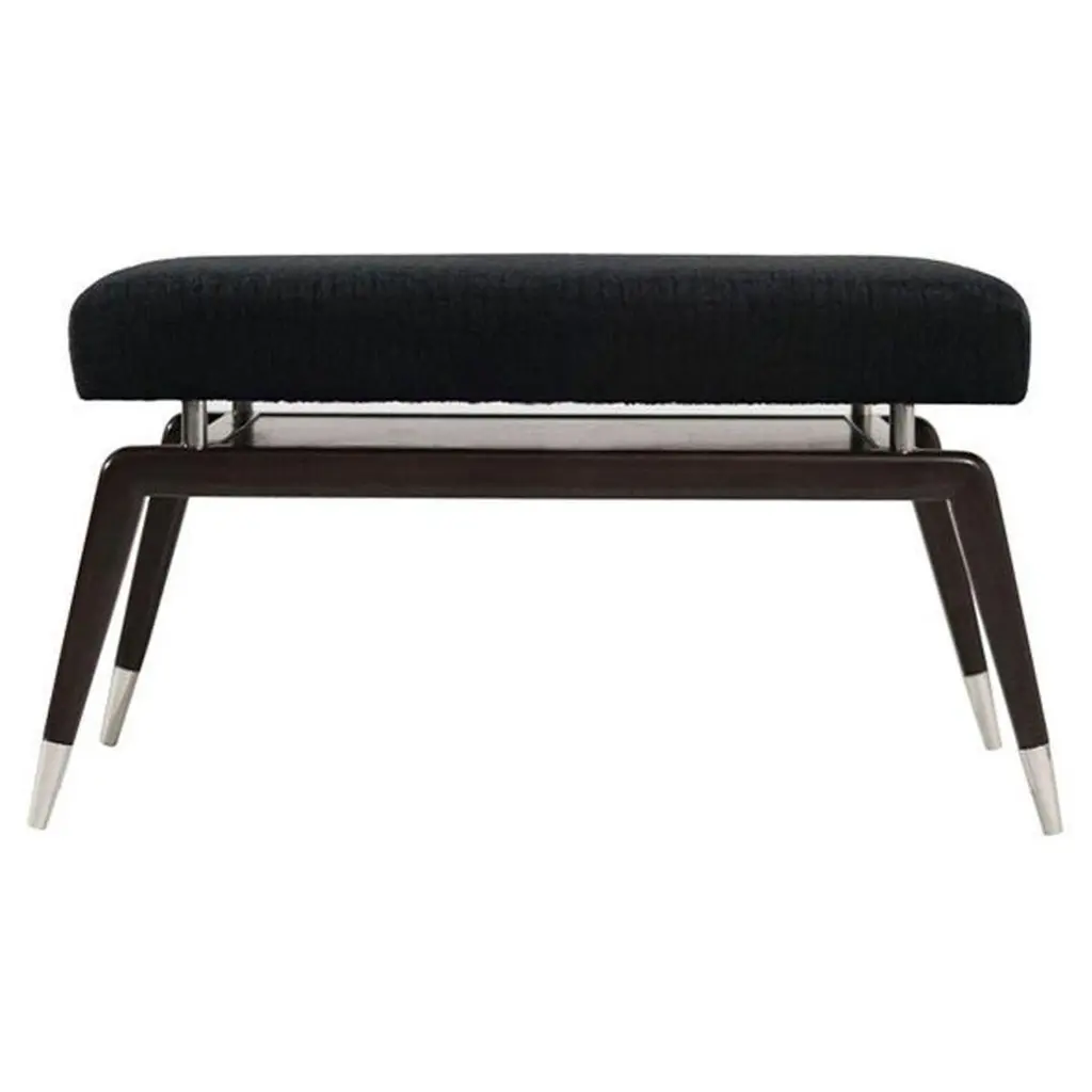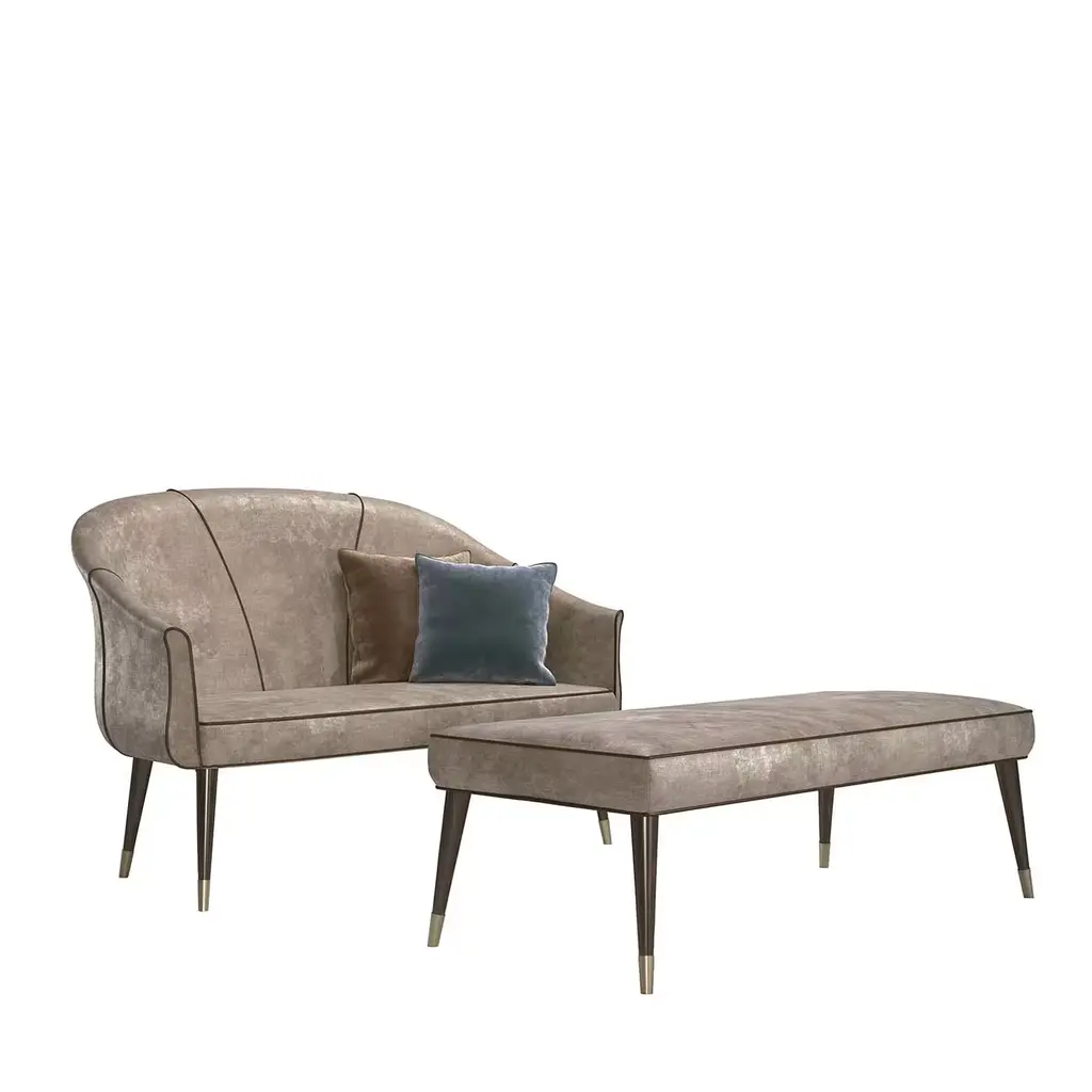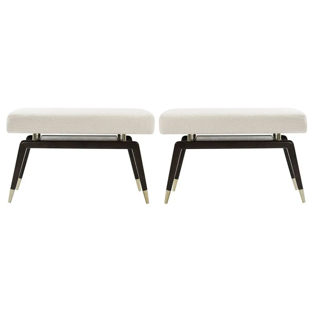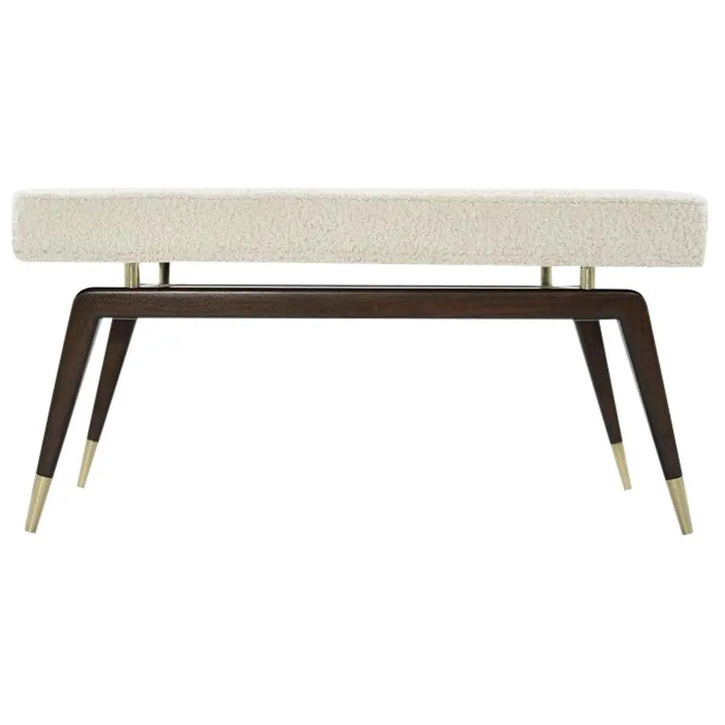 A chic accent piece that will fit harmoniously in any setting, this bench conveys a sense of timeless elegance. Skillfully balanced between classic and modern designs, this piece is pleasing to the eyes and to the touch with its padded seat upholstered with soft velvet fabric in light taupe and contrasting brown piping. The flared, conical legs are made of ebonized wood and are accented with bronzed metal ferules. The ideal companion to the Giglio sofa, this bench becomes a functional surface to display decorative trays with plants, flowers or candles. Cushions not included.