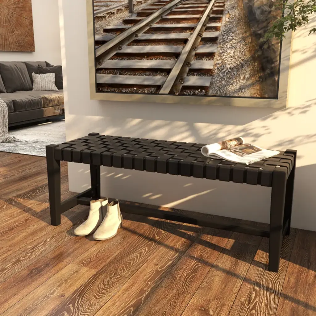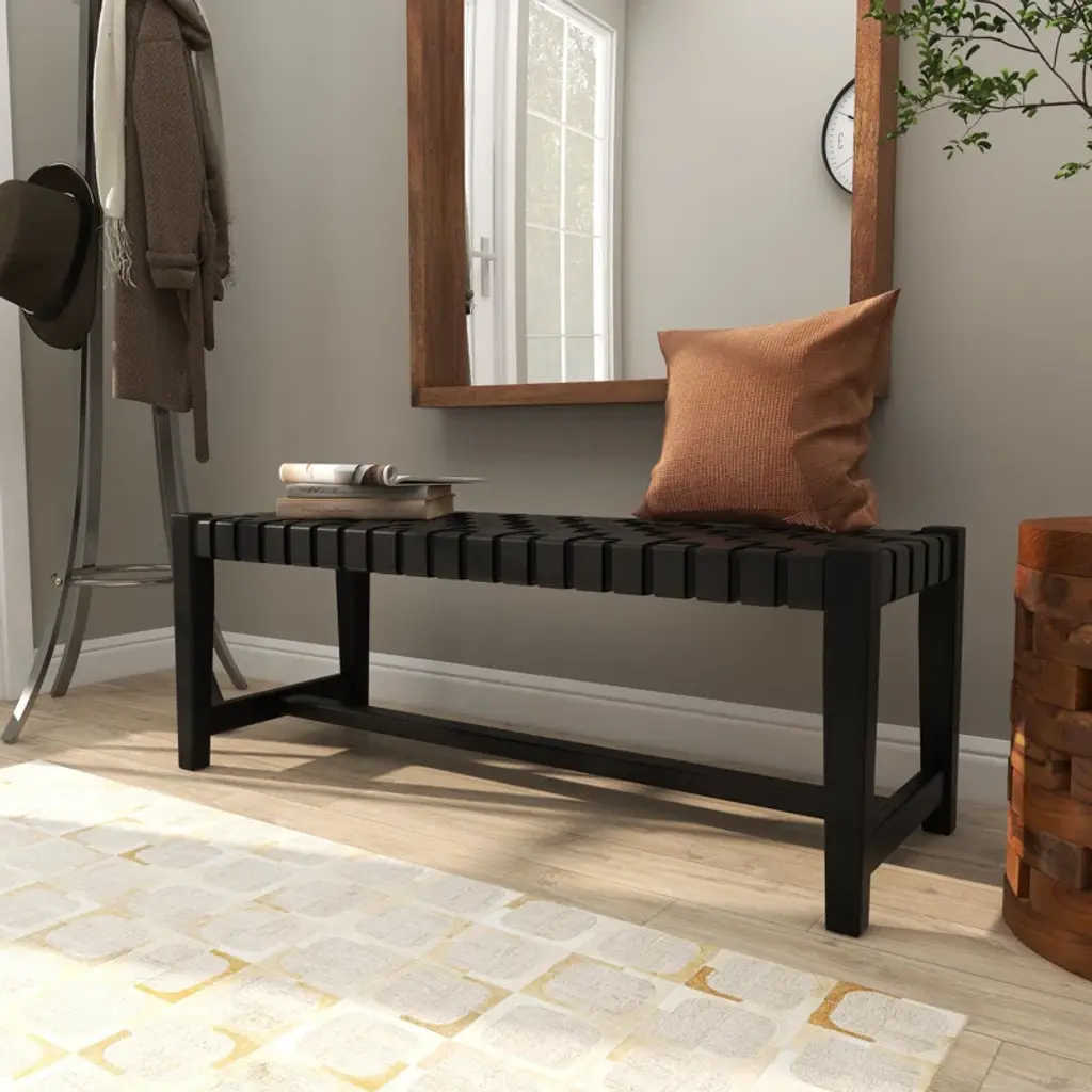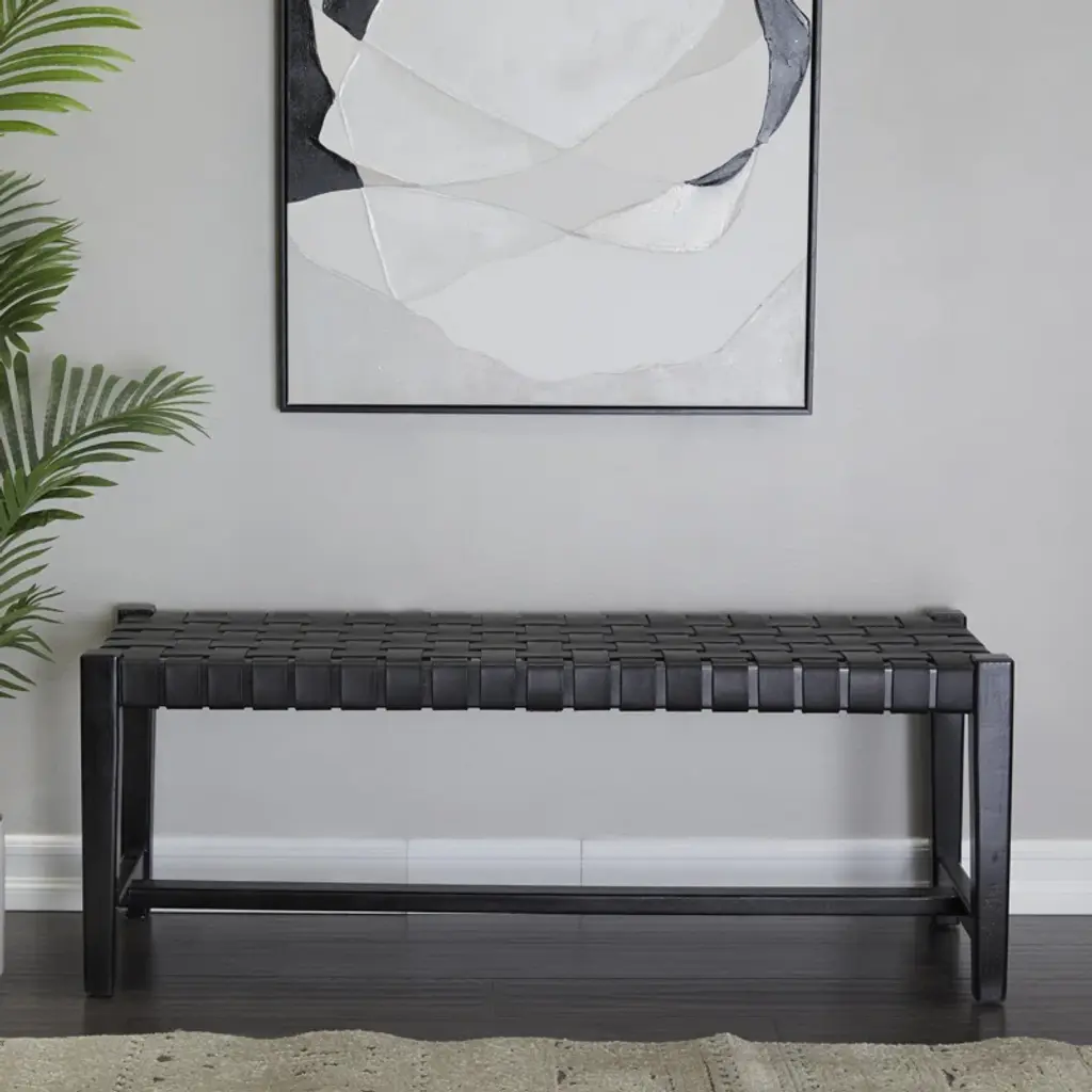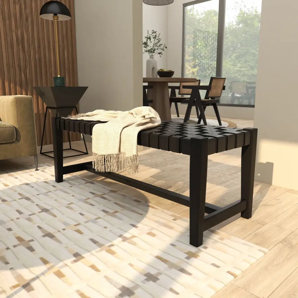 Elevate your home's interior with this modern bench, perfect for adding a touch of sophistication to your bedroom or living room. Handcrafted with an upholstered seat and solid wood squared legs, this bench offers both style and comfort. As a natural product, the leather and hair-on-hide accents showcase subtle variations in pattern and color, making each piece truly one-of-a-kind. Fully assembled and ready for use, this bench can seat two people. Made in Indonesia, it brings a contemporary flair to your indoor space.