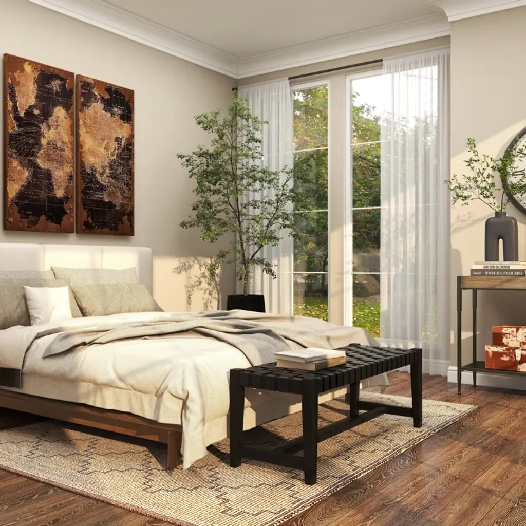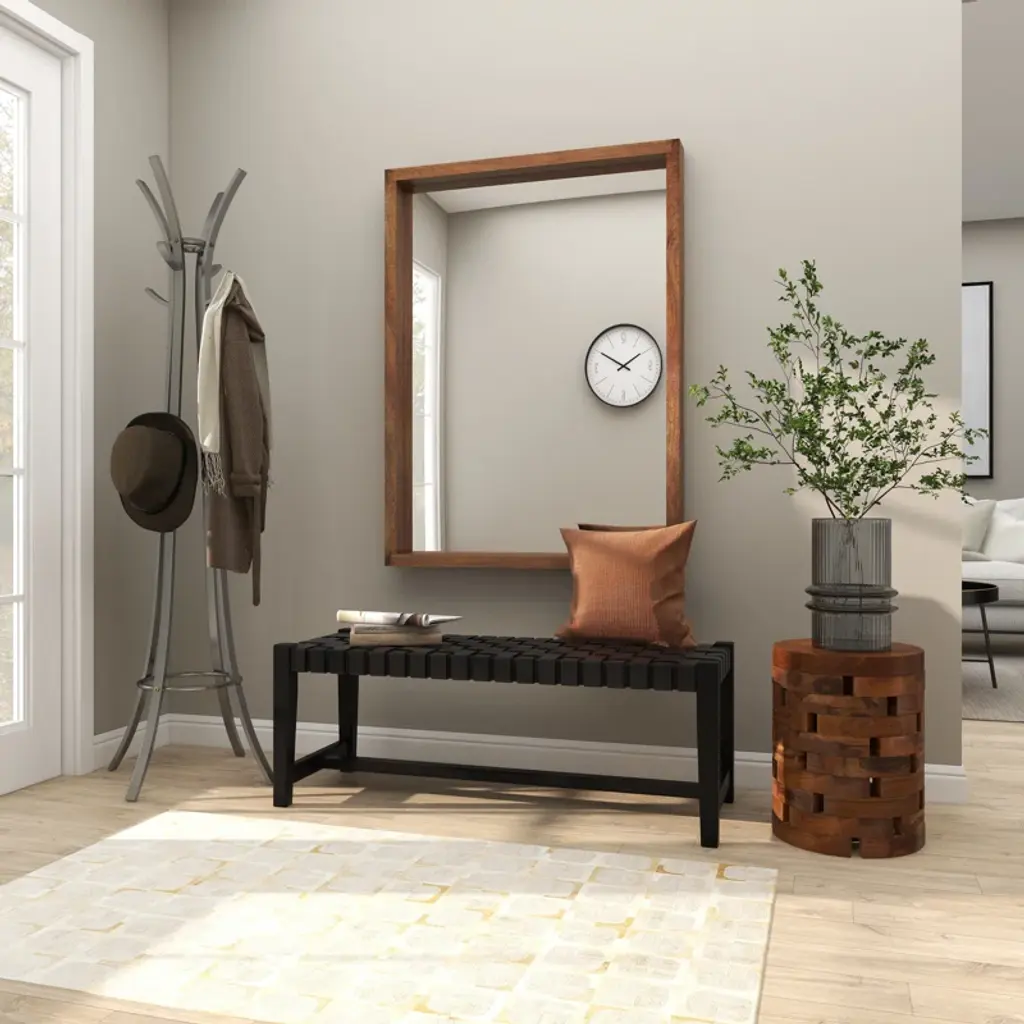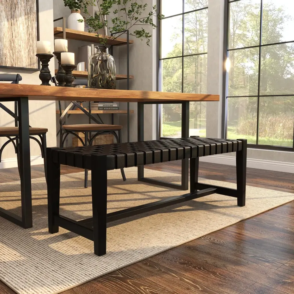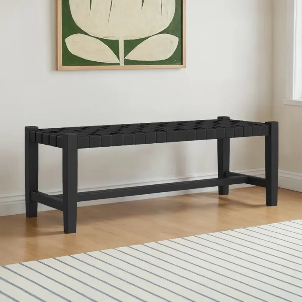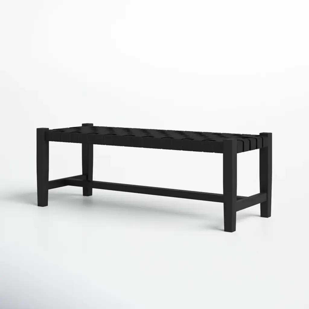 Elevate your home's interior with this modern bench, perfect for adding a touch of sophistication to your bedroom or living room. Handcrafted with an upholstered seat and solid wood squared legs, this bench offers both style and comfort. As a natural product, the leather and hair-on-hide accents showcase subtle variations in pattern and color, making each piece truly one-of-a-kind. Fully assembled and ready for use, this bench can seat two people. Made in Indonesia, it brings a contemporary flair to your indoor space.