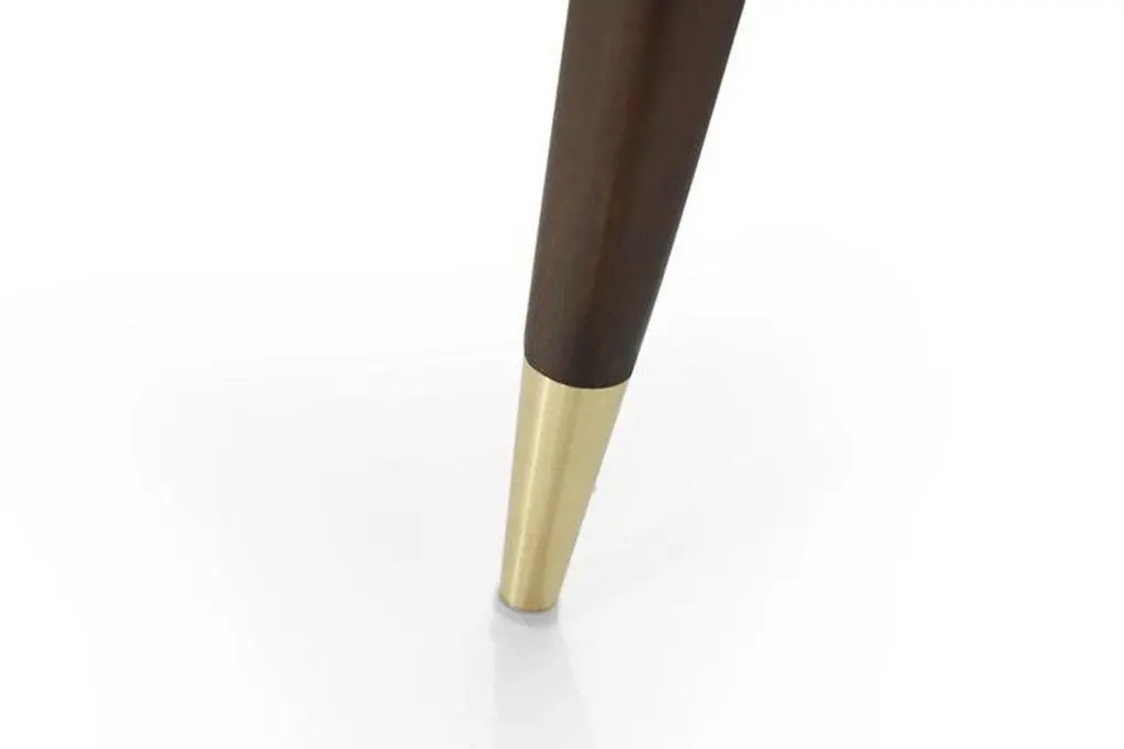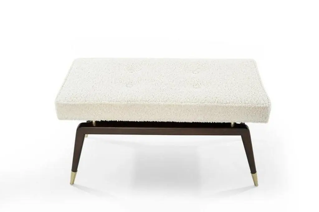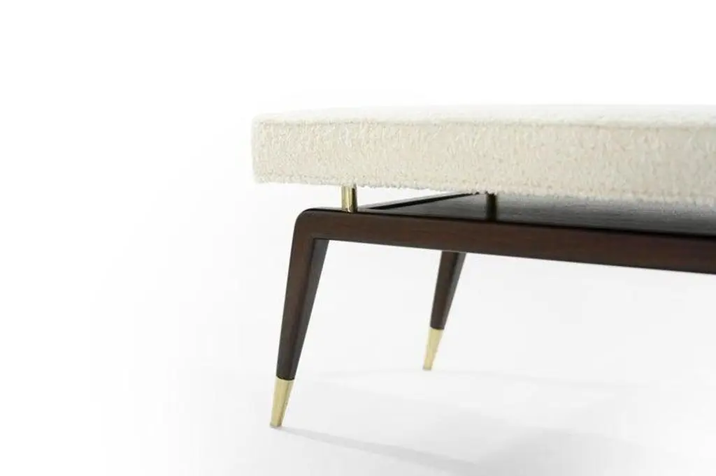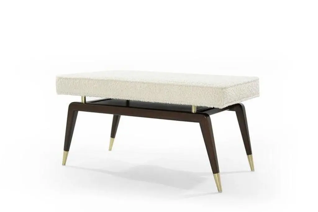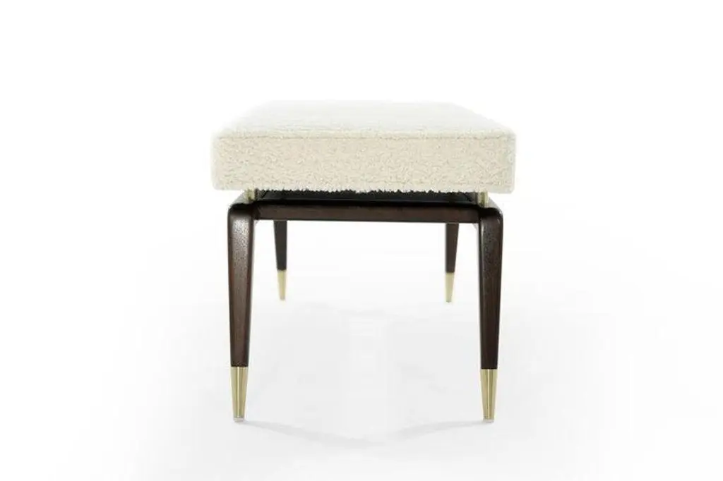 The Gio Bench by Stamford Modern: a perfect blend of Gio Ponti's timeless design and modern functionality. This elegant bench features signature angled legs with metal sabots for added stability and longevity. The upholstered cushion, elevated by metal risers, offers both refined elegance and structural integrity.Personalize your bench with custom metal and wood finishes. View all images for finish options.Available COM or COL only (3 yards). Please contact us for custom dimensions to ensure a perfect fit for your space.