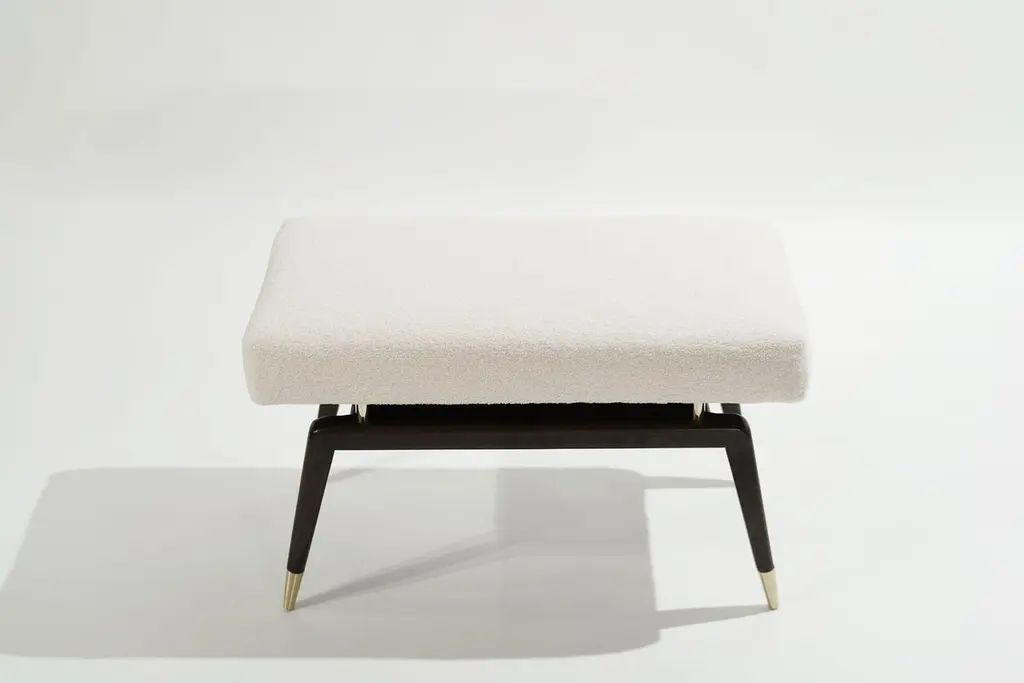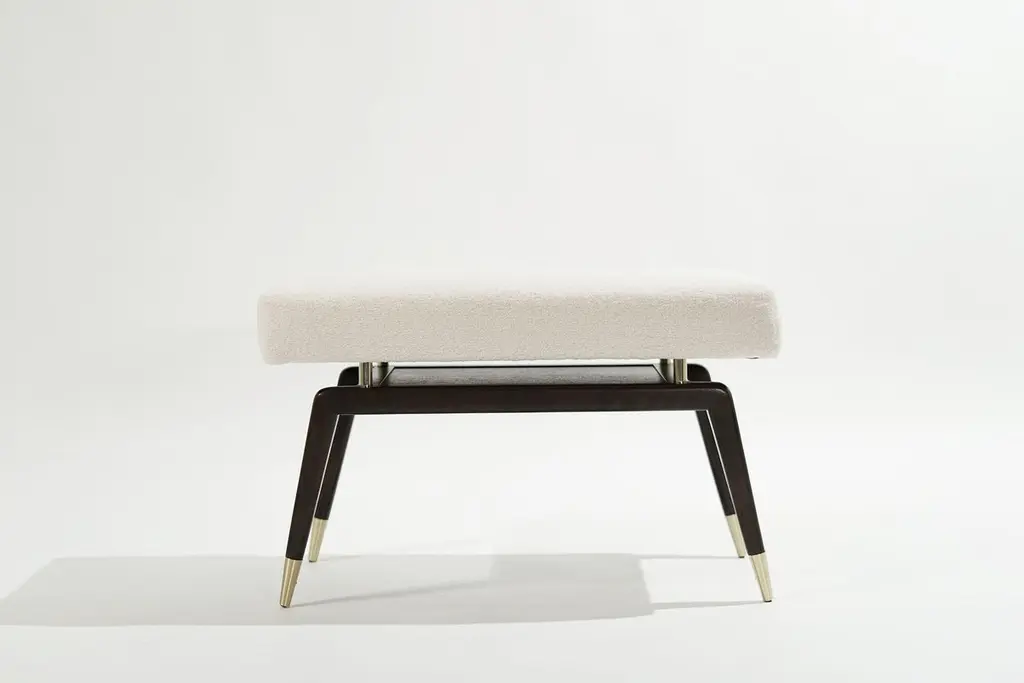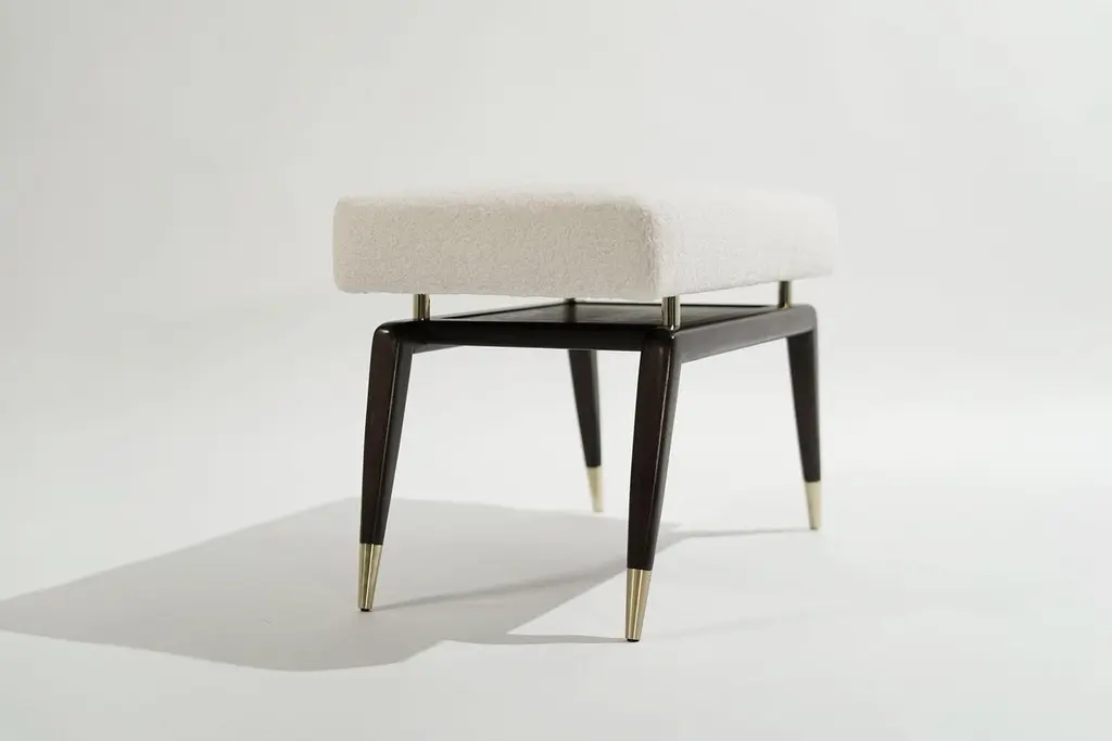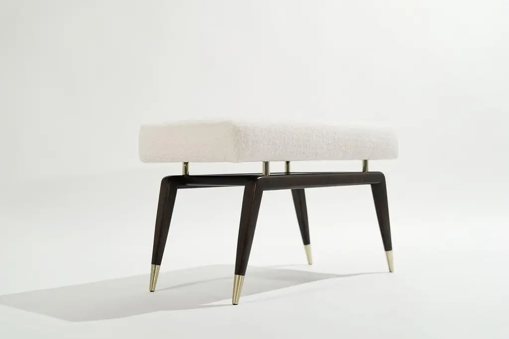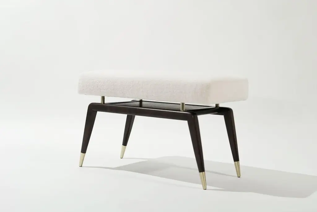 Discover The Gio Bench by Stamford Modern: Inspired by the iconic Gio Ponti, this bench seamlessly marries classic elegance with modern functionality. Its distinctive angled legs, adorned with metal sabots and risers, support a sumptuous upholstered cushion, offering both stability and luxury. Available in COM or COL, with a lead time of 5-6 weeks. Explore our range of wood and metal finishes in the images provided.Elevate your space with The Gio Bench—a testament to timeless sophistication, embodying Ponti's design philosophy. Contact us for quotes on custom dimensions and finishes to create your perfect piece.