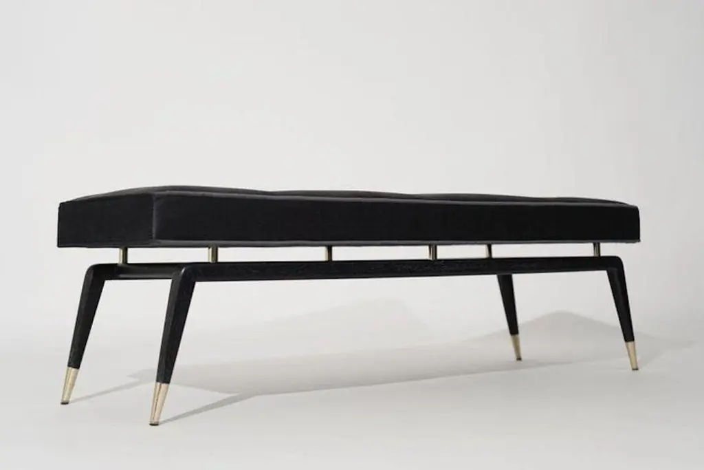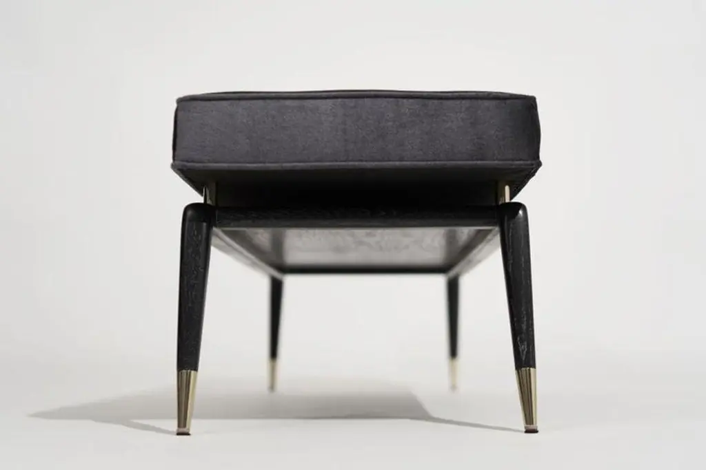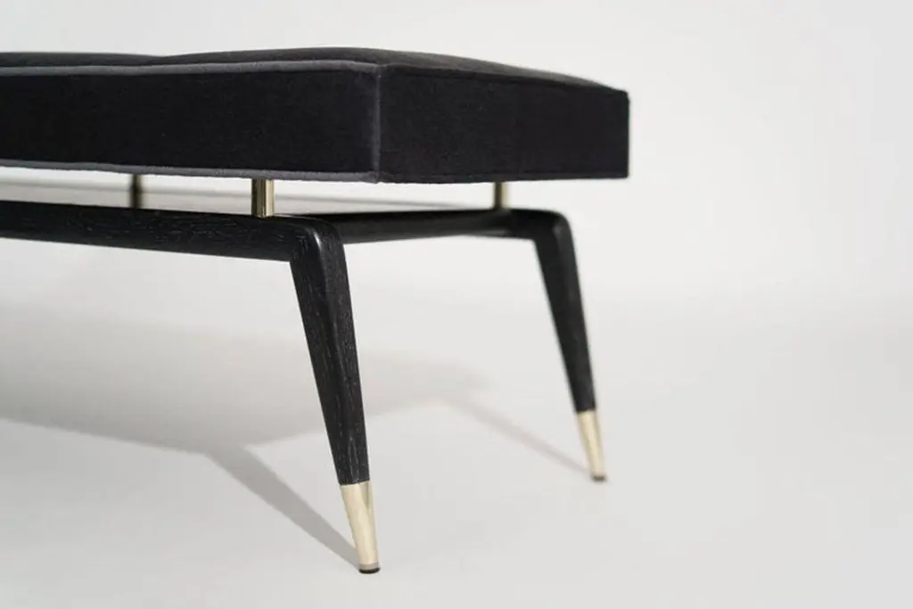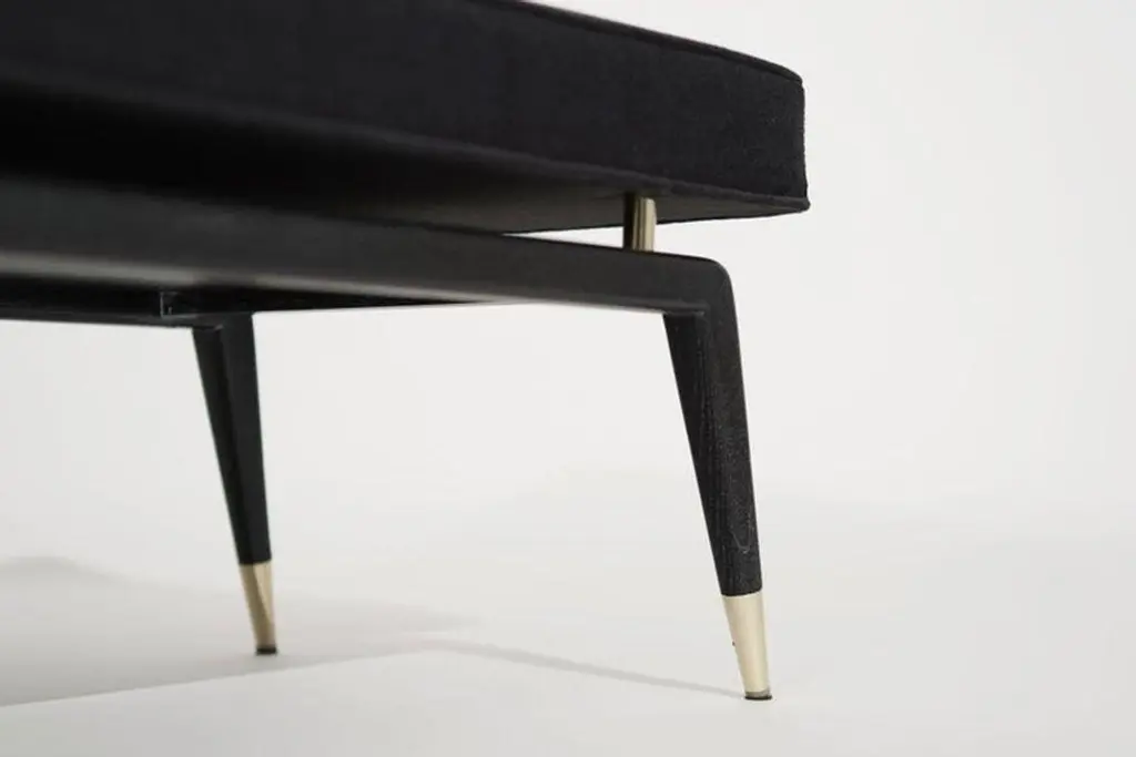The Gio Bench by Stamford Modern: a perfect blend of Gio Ponti's timeless design and modern functionality. This elegant bench features signature angled legs with metal sabots for added stability and longevity. The upholstered cushion, elevated by metal risers, offers both refined elegance and structural integrity.Personalize your bench with custom metal and wood finishes. View all images for finish options.Available COM or COL only (4 yards). Please contact us for custom dimensions to ensure a perfect fit for your space.