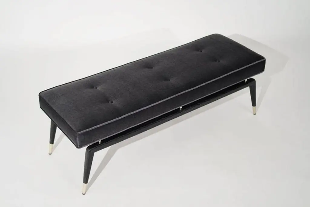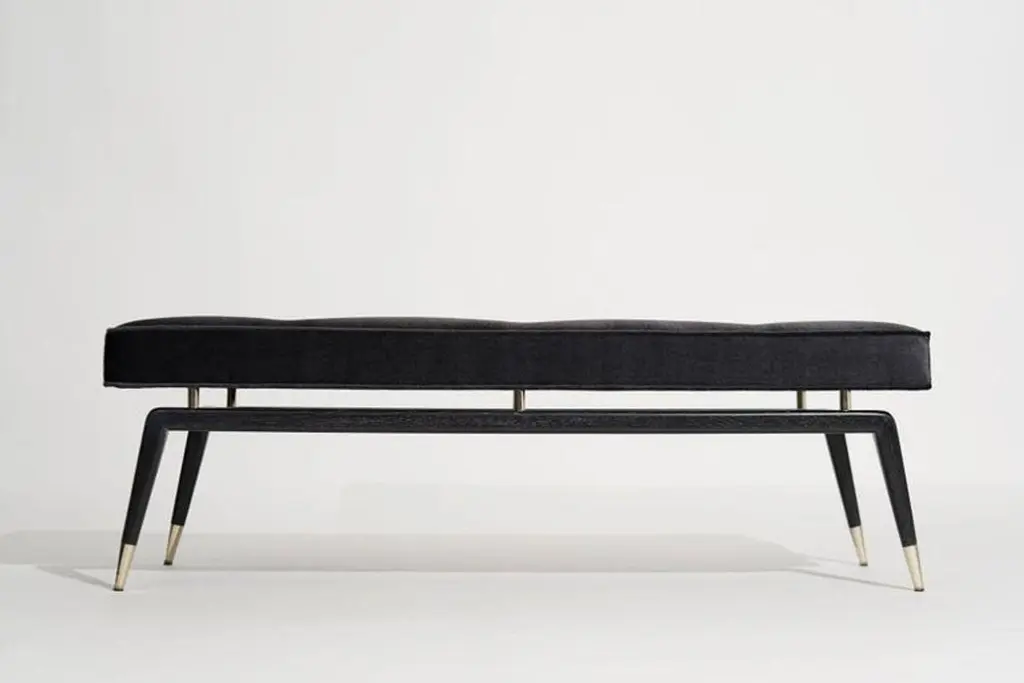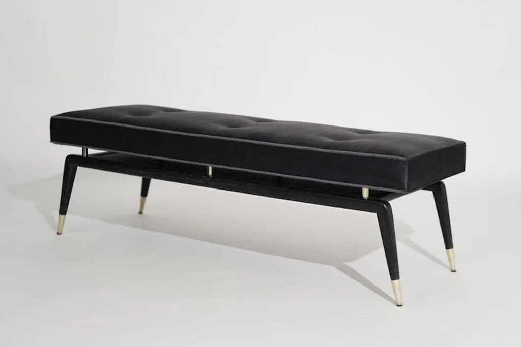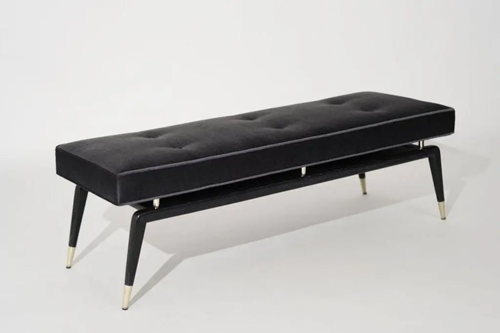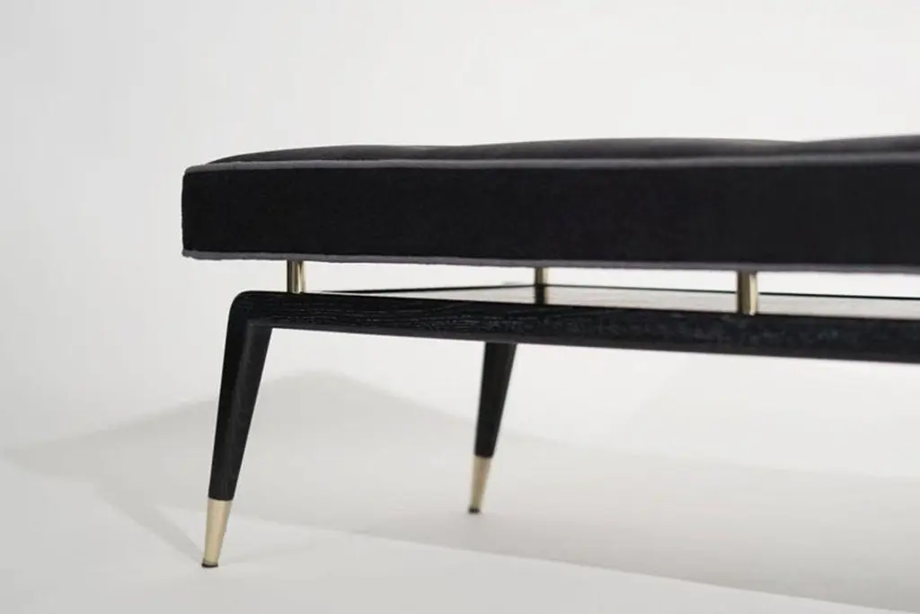 The Gio Bench by Stamford Modern: a perfect blend of Gio Ponti's timeless design and modern functionality. This elegant bench features signature angled legs with metal sabots for added stability and longevity. The upholstered cushion, elevated by metal risers, offers both refined elegance and structural integrity.Personalize your bench with custom metal and wood finishes. View all images for finish options.Available COM or COL only (4 yards). Please contact us for custom dimensions to ensure a perfect fit for your space.